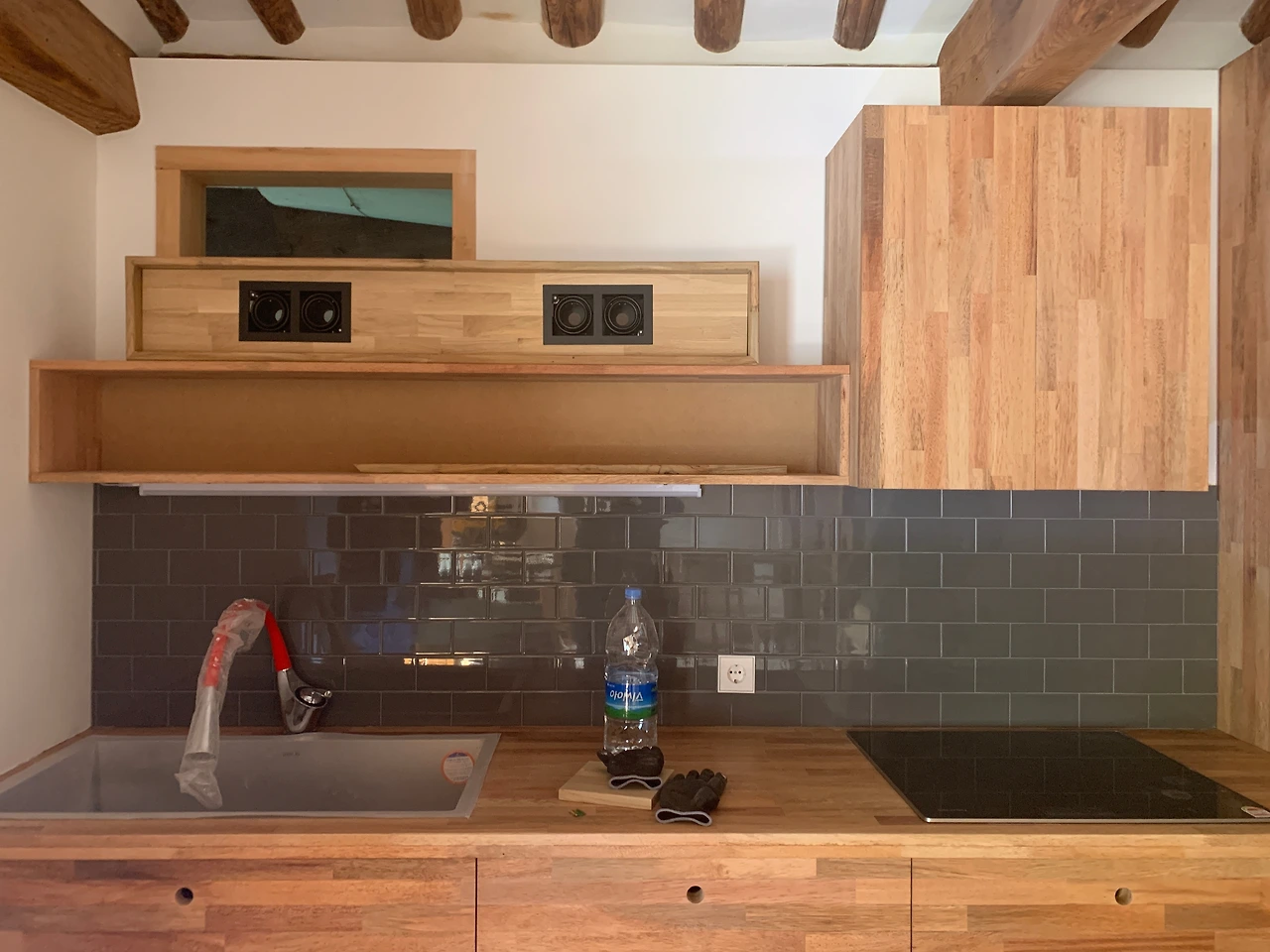 주방 조리대 위에 달릴 조명은 흡사 오디오 스피커처럼 보였다. 티크로 단정하게 만들어진 조명 프레임이 정말 이뻤다. 위 사진 왼쪽 주방 창문 아래 직사각형 나무가 천정에 붙을 조명이다.