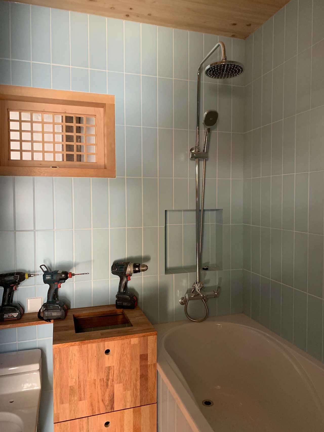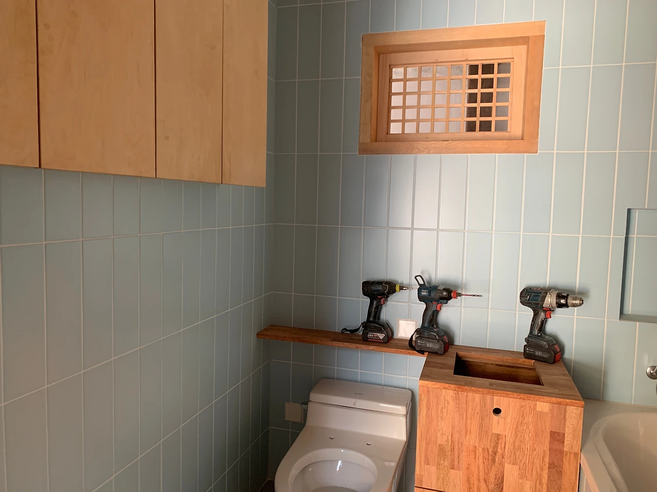 욕실의 수납장은 자작나무로 만들었다. 밝고 단정한 색이