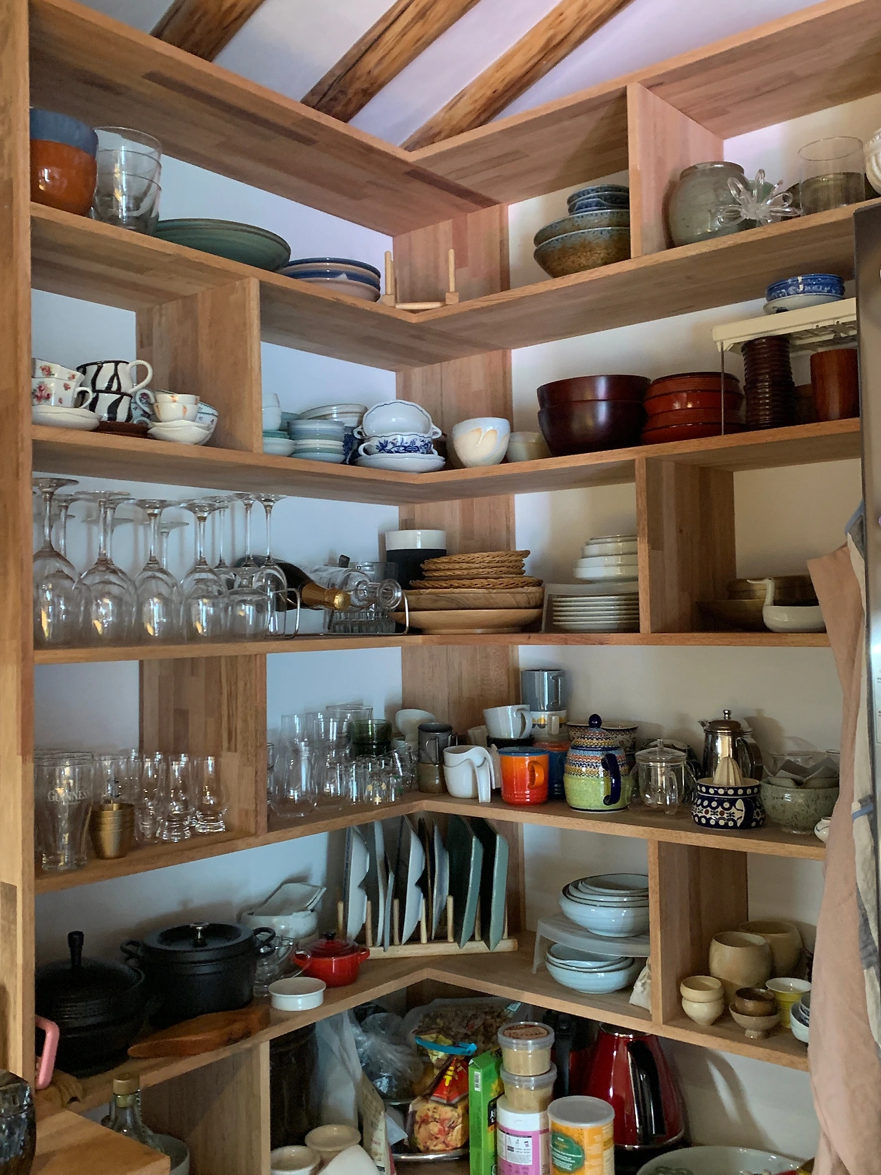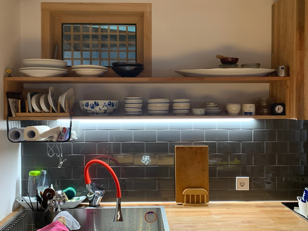 주방은 오픈형이다. 먼지와의 전쟁을 하겠지만 일단 이렇게 사용하기로 했다. 싱크대 위는 상부장을 두지 않았다. 키가 작아 상부장을 거의 사용하지 않기 때문이다.