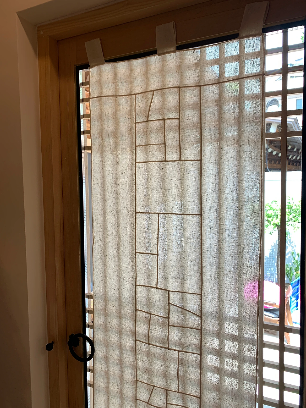 삼베로 작업을 하시는 예고은삼베 박자야 선생님께서 이쁜 삼베 가리개를 선물로 보내주셨다. 손님 방과 우리 방의 문에 하나씩 걸었더니 제법 잘 어울렸다. 삼베엔 항균 기능이 있다 하니 더 좋다. 나는 삼베 수세미로 설거지를 한 이후론 세제를 거의 쓰지 않고 얼굴 세안도 삼베 얼굴 타월로 한다. 이밖에도 마스크와 행주 등도 삼베 제품을 쓰는데 만족도가 높다.