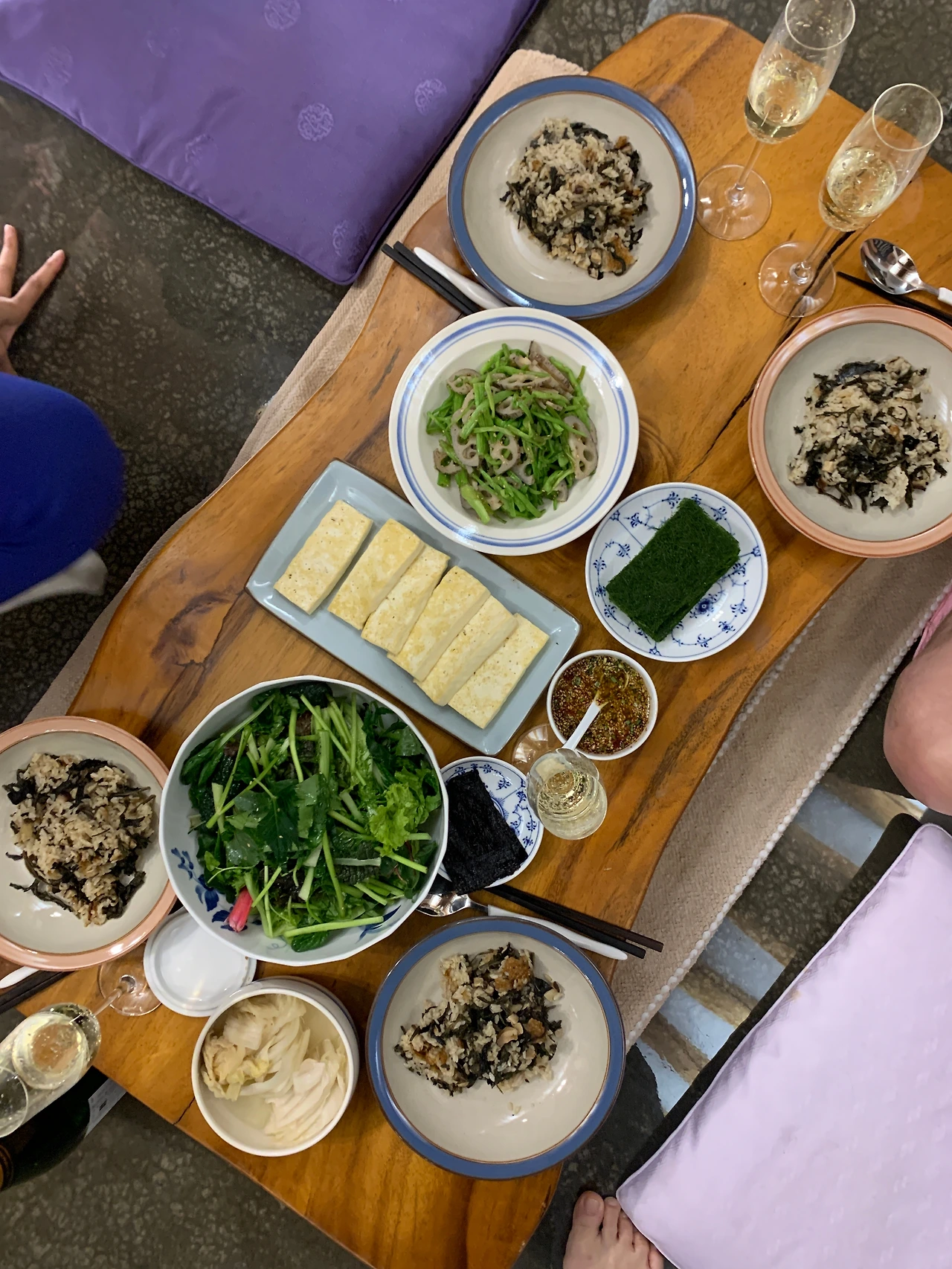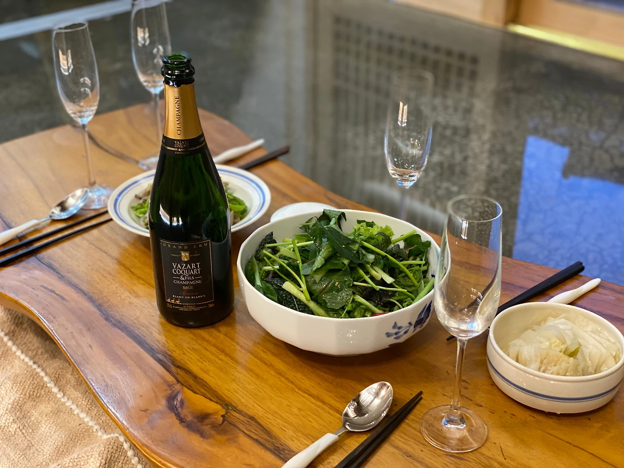 손님을 위한 첫 밥상은 우리가 살던 집에 살게 된 분과 우리의 이웃이며 빈집을 찾아 공간에 온기를 불어넣는 <공간주> 이정옥 대표를 위해 차렸다. 사실 우리 부부도 아직 제대로 음식을 차려먹지 않았으니 우리 부부를 위한 첫 만찬이라고도 할 수 있다. 우리가 살던 집에 살게 된 이는 비건이다. 그래서 첫 만찬은 비건 밥상을 준비했다. 선물 받은 샴페인도 따며 기분을 냈다. 한참 이야기 꽃이 무르익을 무렵, 우리 독서 모임 <독하다토요일> 멤버 한 분인 근처라며 방문해도 괜찮냐 하셨다. 무시로 사람들이 드나드는 집을 만들고 싶은 우리 부부는 당연히 좋다고 했고, 저녁 9시 무렵엔 7명이 모인 술자리로 이어졌다.