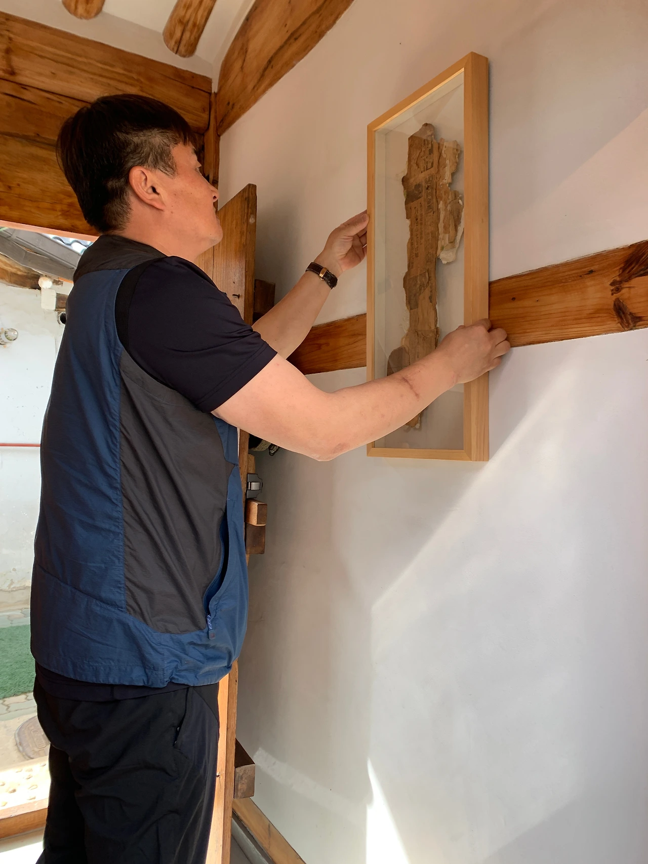 정수기 설치를 위한 타공과 몇 가지 우리 부탁을 들어주기 위해 임정희 목수님께서 방문하셨다. 집을 철거하며 수집한 9겹의 벽지를 대문 안쪽에 걸어 주셨다.