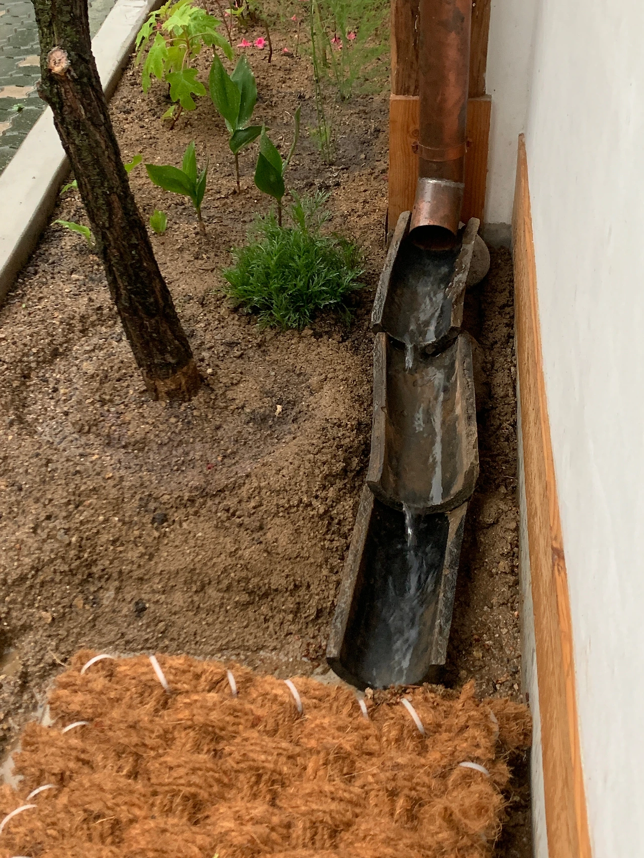 우리 집 물받이는 마당과 골목의 화단으로 향한다. 특히 골목 화단은 빗물 인도에 신경을 썼다. 화단으로 직접 쏟아지면 나무가 상할 거 같아서다.