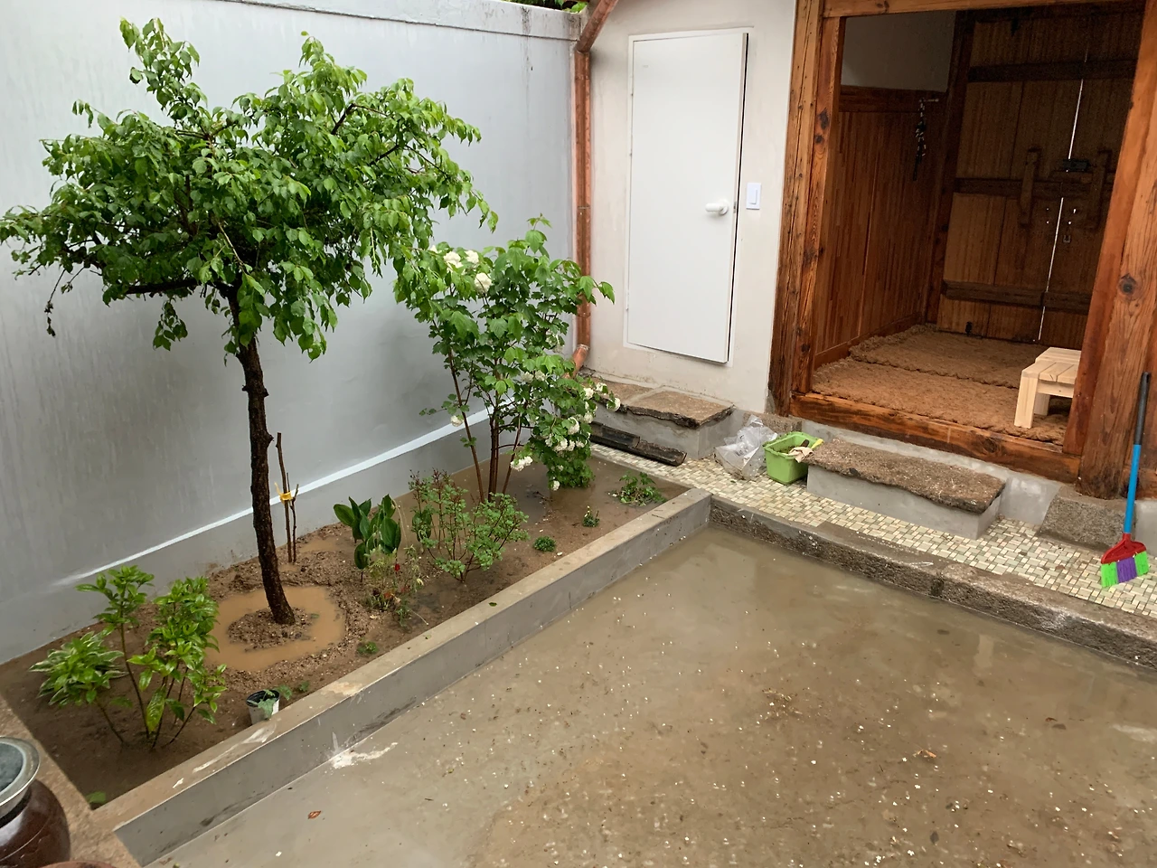 마당엔 작은 배수구가 있다. 보통 양의 물은 배수구로 자연스럽게 빠진다. 비가 갑자기 많이 내리니 배수구가 물을 견디지 못했다. 문제는 비에 쓸려온 나뭇잎을 비롯한 이물질을 배수구가 막아내지 못했기 때문이다