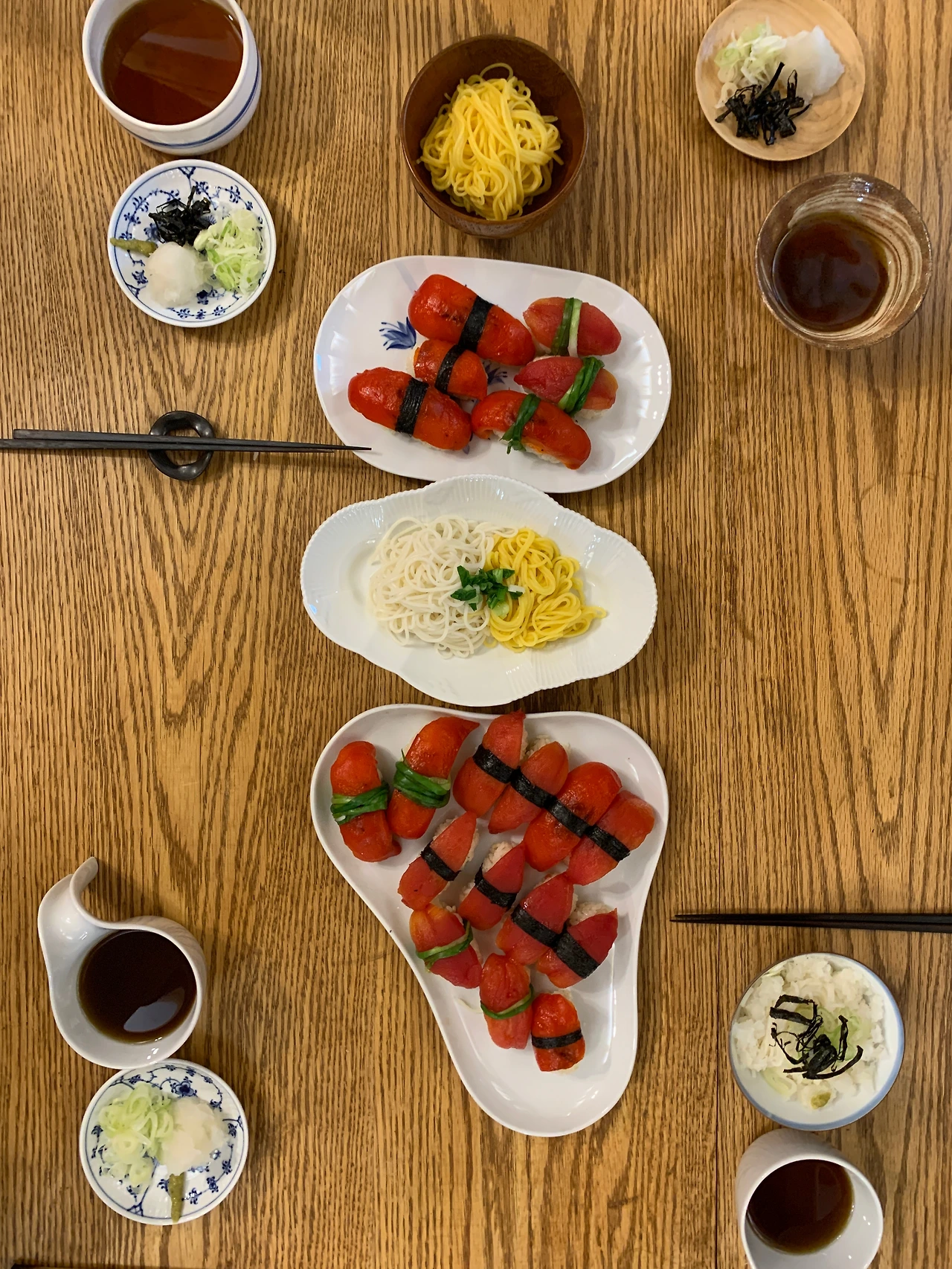 그리고 우리는 이번에 같이 참여하게 된 <살리다프로젝트>의 꾸러미로 토마토와 파프리카 초밥과 모밀소바를 같이 만들었다. 살리다프로젝트는 상품성이 떨어진 그러나 먹는 데 전혀 지장이 없는 채소꾸러미를 우리에게 보내주면 비건식 레시피는 유튜브에 공유해줬다. 채소꾸로미를 받아 비건식으로 음식을 하고 그것을 먹으며 기후 위기와 환경에 대해 생각해 보는 계기가 되었다.
