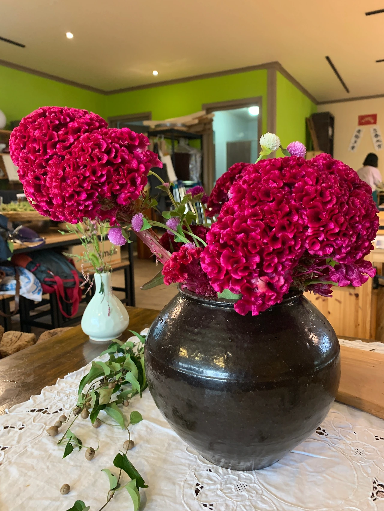 수업 전에 늘 실상사 주변 숲 속을 탐험했다. 지리산 정상은 선생님께서 지도해 주신 이 시간에 우리 산과 들에서 자라는 이름을 알지 못했던 무수한 식물과 만났다. 숲을 거닐며 지천에 널린 들꽃으로 테이블을 장식하는 것도 내겐 아주 큰 즐거움이었다. 이번엔 특별히 전종윤 선생님께서 꽃차를 만들기 위해 밭에서 기른 맨드라미를 가져오셔서 옹기 항아리에 꽂았다. 옹기와 맨드라미가 너무 잘 어울렸다