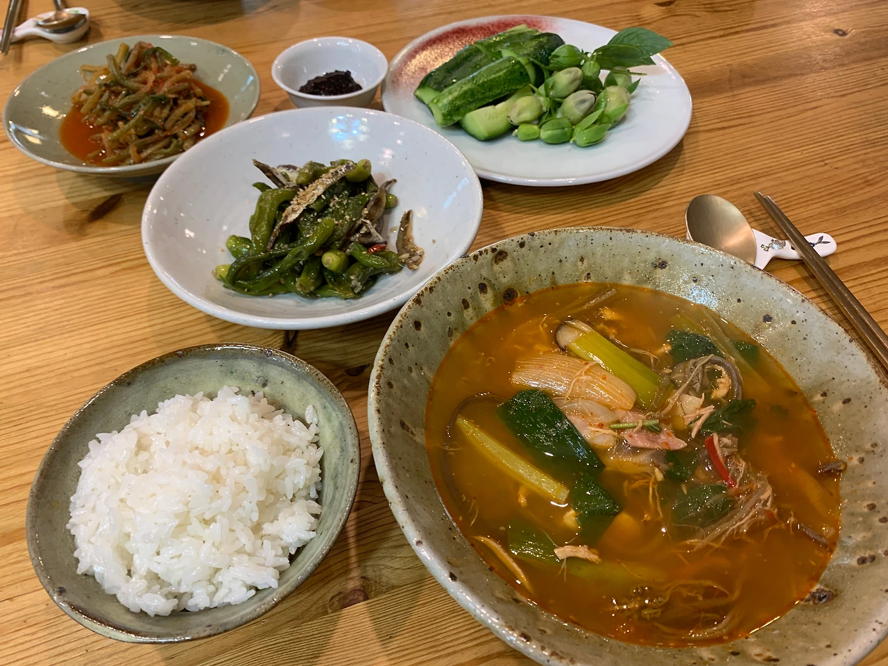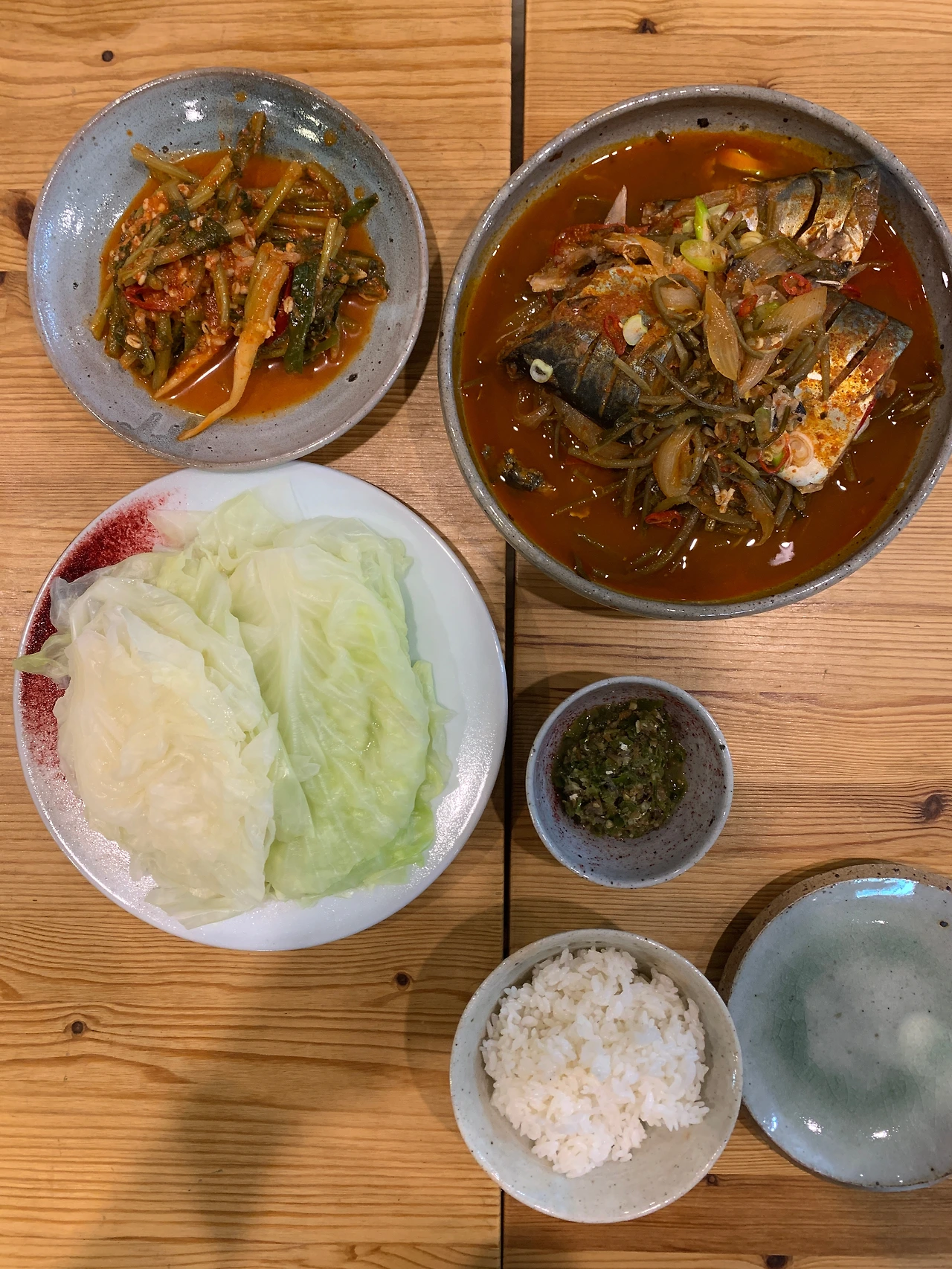 수업 시작 전 토요일 점심은 원래 근교를 돌아다니며 먹기로 했다. 코로나19로 인해 이것이 여의치 않았다. 수업 전에 도착한 수강생을 위해 선생님은 고구마순을 넉넉히 넣고 신선한 고등어를 조려주셨다.