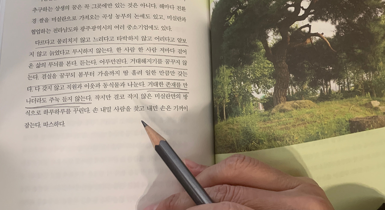어제부터 읽기 시작한 김탁환 작가의 <아름다움은 지키는것이다> 를 읽는 동안에도 내내 연필을 쥐고 읽었다. 남편이 먼저 읽기 시작해 남편이 그어놓은 밑줄 부분은 더 섬세하게 읽었다. 같은 책을 읽어도 남편이 줄을 그른 부분과 내가 그은 부분은 많이 다르다. 남편은 본인의 생각이 확장되는 부분에, 나는 다짐이나 울림이 있는 부분에 밑줄을 긋는다.
