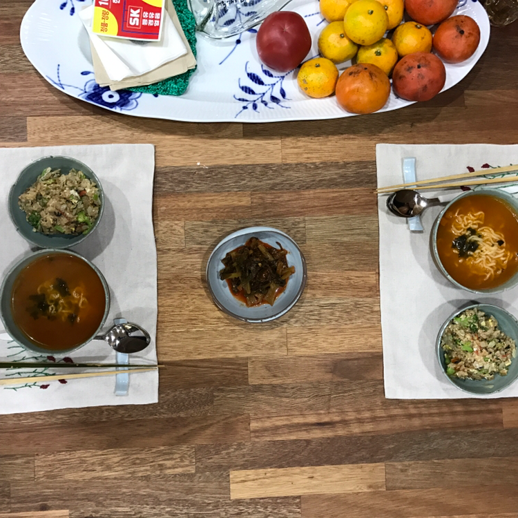 주말 아침였을 것이다. 라면 한개를 끓여 반으로 나눴고 찬밥을 중화풍으로 볶았다.