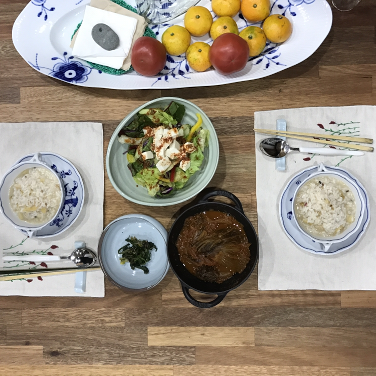 황태죽과 채소샐러드 시금치 나물과 묵은지찜. 이만하면 된다.