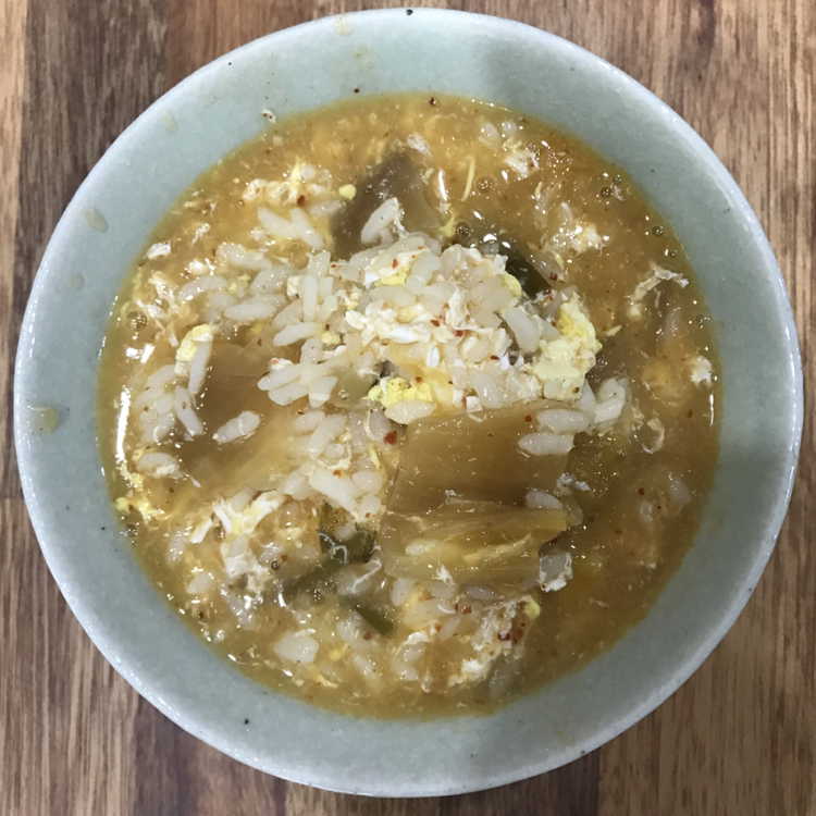 전날 끓인 김치국과 찬밥의 콜라보는김치죽. 계란도 풀면 속도 편하고 해장에도 좋다. 아. 국에 육수를 더해 간을 싱겁게 해야한다.