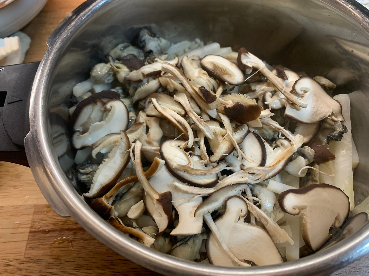 3. 쌀 위로 물이 안 보일 정도로 자작해지면 굴과 버섯을 차례로 올리고 청주 1큰술을 끼얹는다.