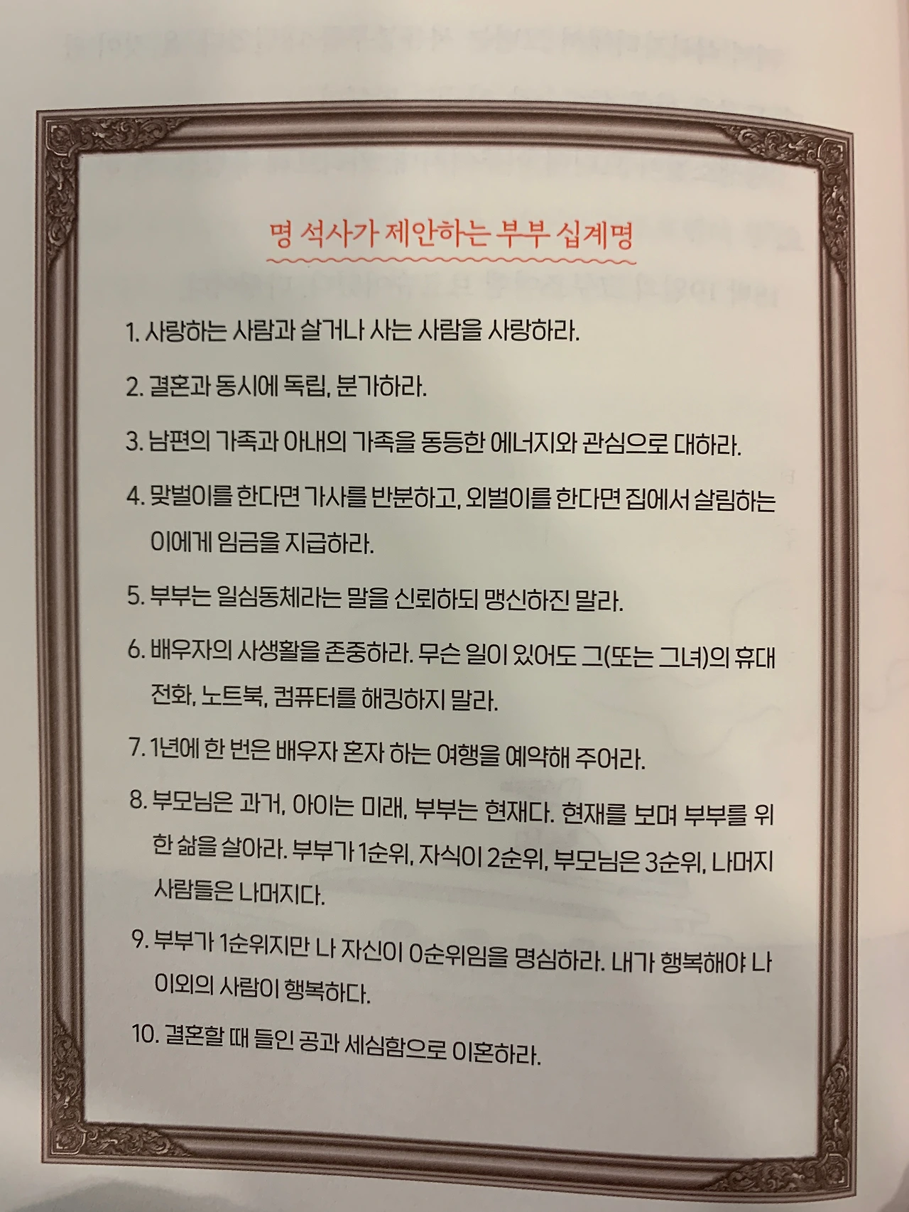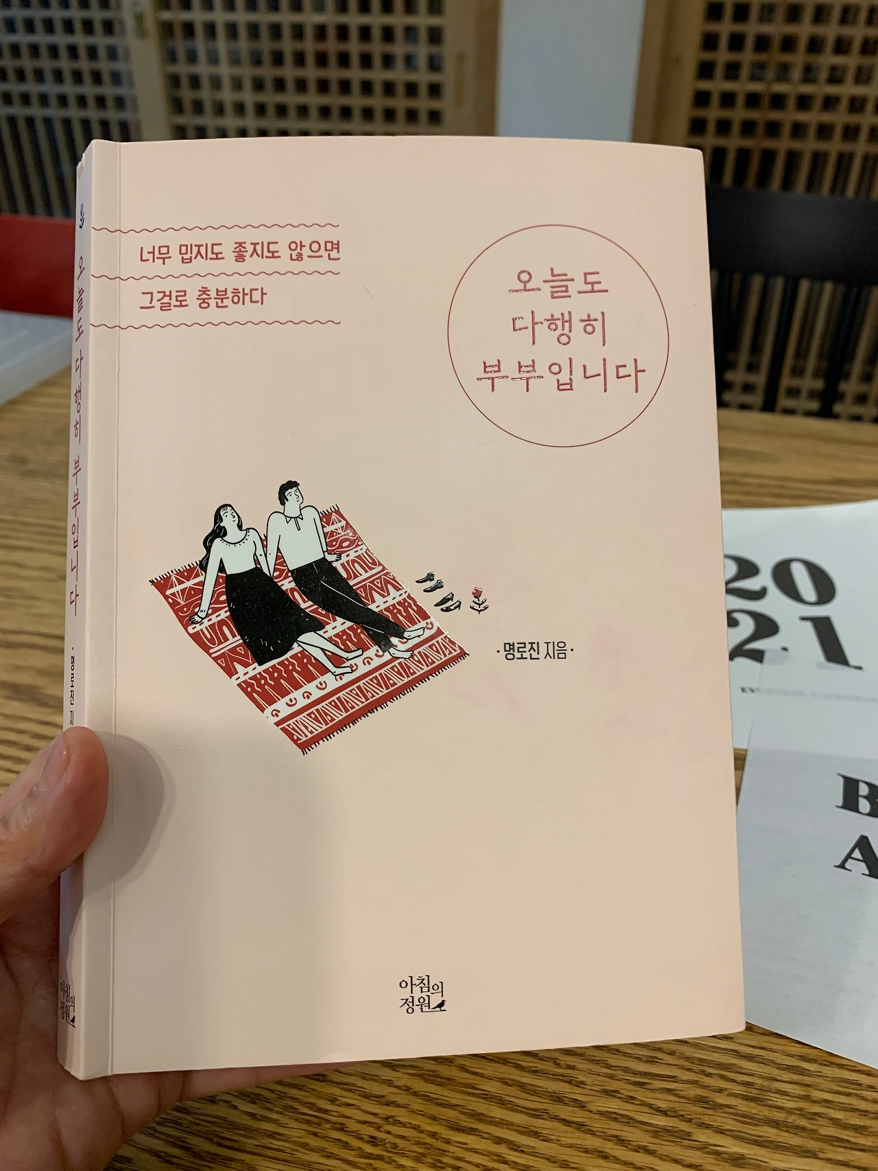 새해 첫 책은 <오늘도 다행히 부부입니다> 명로진 작가의 지금 대한민국 부부 보고서이다. 우리나라 다양한 부부의 모습을 사례로 들며 조금 현명한 부부로 살 수 있는 작은 방법을 제시한다. 그렇다고 한번 맺은 인연 끝까지 가야한다고 강요하지 않는다. 다만 기왕 다행히 아직은 부부라면 상대에 대해서 조금 알아야 한다고 말한다. 사례 중엔 우리 부부의 모습한 비슷한 형태의 부부(경제 면)도 등장해 우리 부부의 지금도 생각해보게 했다. 그리고 21세기 경쟁력있는 남편으로 성정시키기 위해 올해부턴 주 1회 정도는 남편이 직접 음식을 해보라고 했고 남편도 쿨하게 오케이했다. 무엇보다 결혼을 했다면 모든 부분에서 부모로부터 독립하라는 말은 매우 중요하다. 우리나라 부부 문제의 상당 부분이 경제적이든 정서적이든 독립하지 못해서 생기는 경우를 종종 봐왔기 때문이다. 결혼에 대해서 고민하는 사람, 결혼 생활이 괜찮은지 의심이 생기는 사람, 자기는 잘하고 있는데 배우자가 좀 이상하다고 생각하는 사람들에게 추천한다. #savvy_book_2021 #bookstagram #명로진작가 #오늘도다행히부부입니다 #bookreview #부부십계명