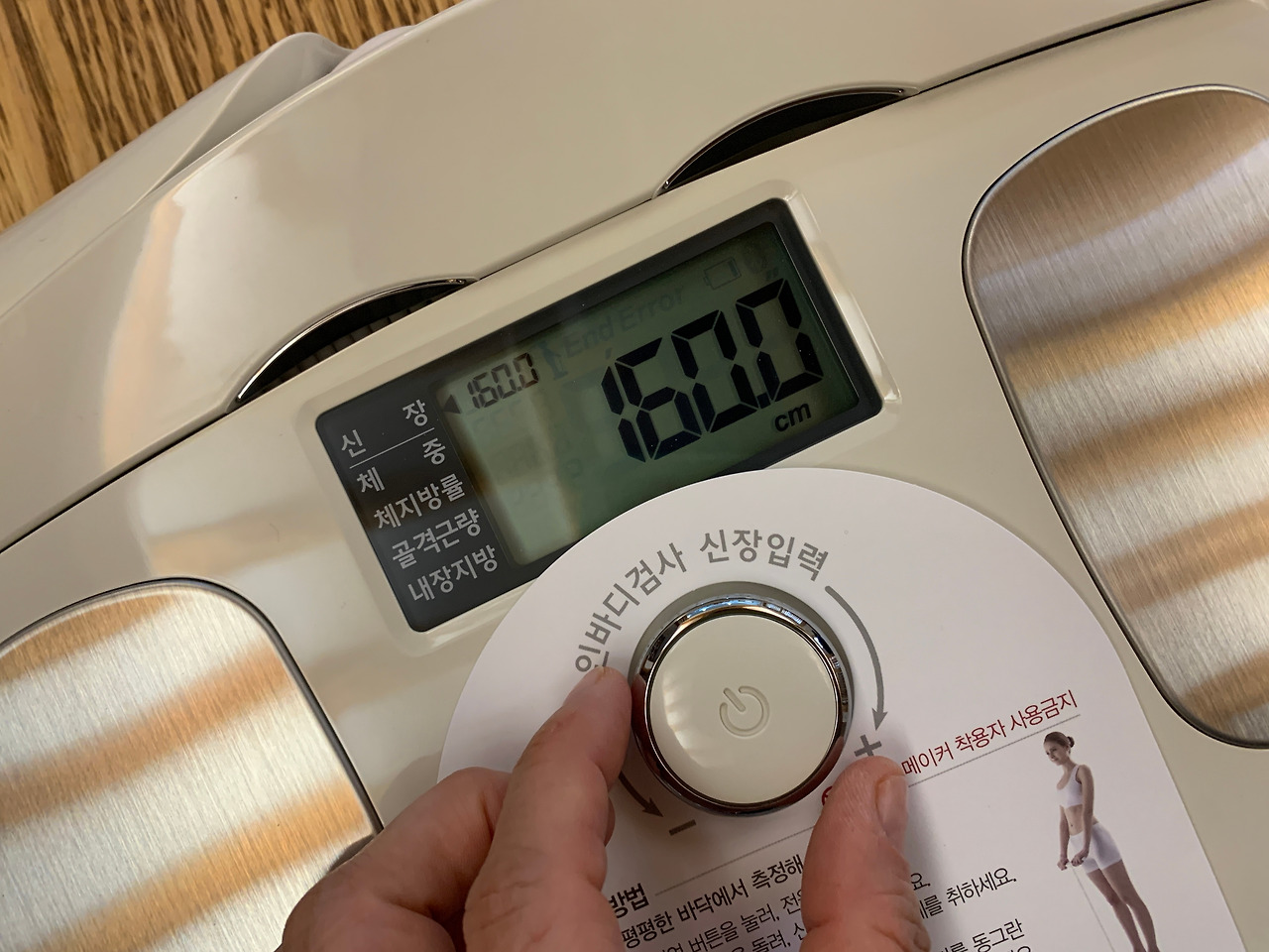 인바디 다이얼 W, 가장 큰 특성은 사용자의 키를 다이얼로 입력한다는 점이다. 기본 세팅은 160으로 되었다. 다이얼을 돌려 자신의 키를 정확하게 입력하면 된다. 인바디에서만큼은 살짝 속이던 자신의 키를 정확하게 입력하는 것이 중요하다. 그래야 체질량 등을 정확하게 얻을 수 있다.