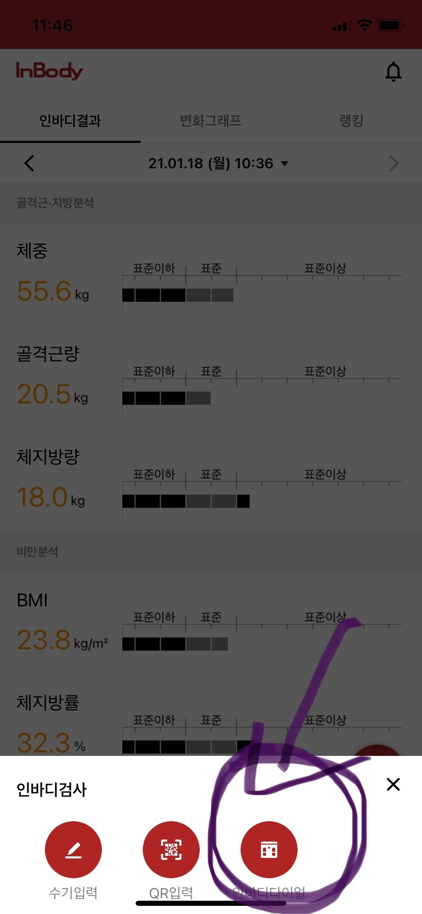 물론 수기로 입력할 수도 있고 경우에 따라선 인바디 용지에 인쇄된 QR로 입력할 수도 있다.