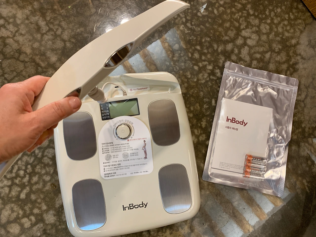인바디 다이얼 제품과 매뉴얼, 제품에 사용한 건전지 4개가 다이다.