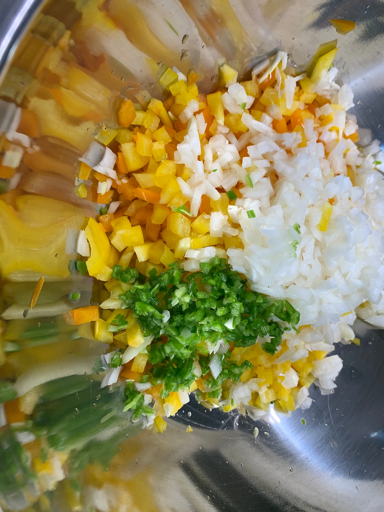 물기를 제거한 양배추, 파프리카, 양파는 모두 잘게 썬다.