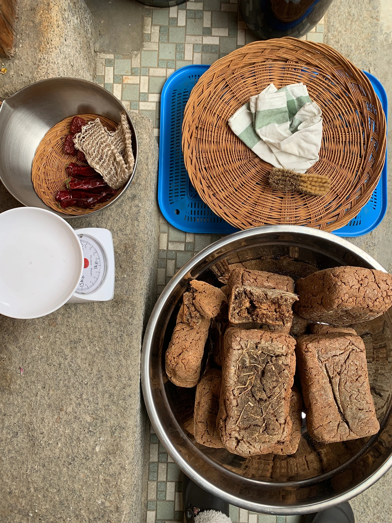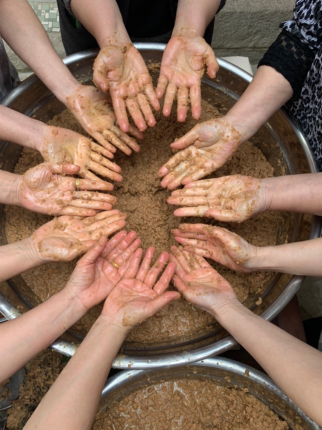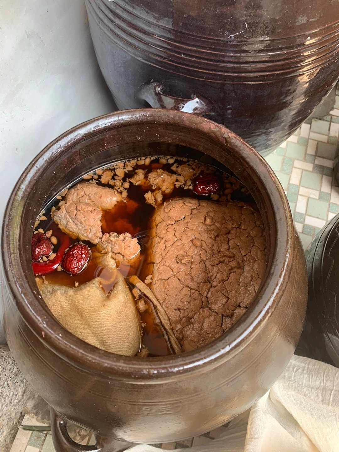 1)메주 6장, 물 45리터, 소금(한주소금) 9킬로그램, 마른고추, 대추 2)메주 3장, 소금 2킬로그램, 마른고추, 대추 총 두 항아리를 담갔죠. 메주는 광양 정토사 법진스님이 띄우신 것으로 했습니다.