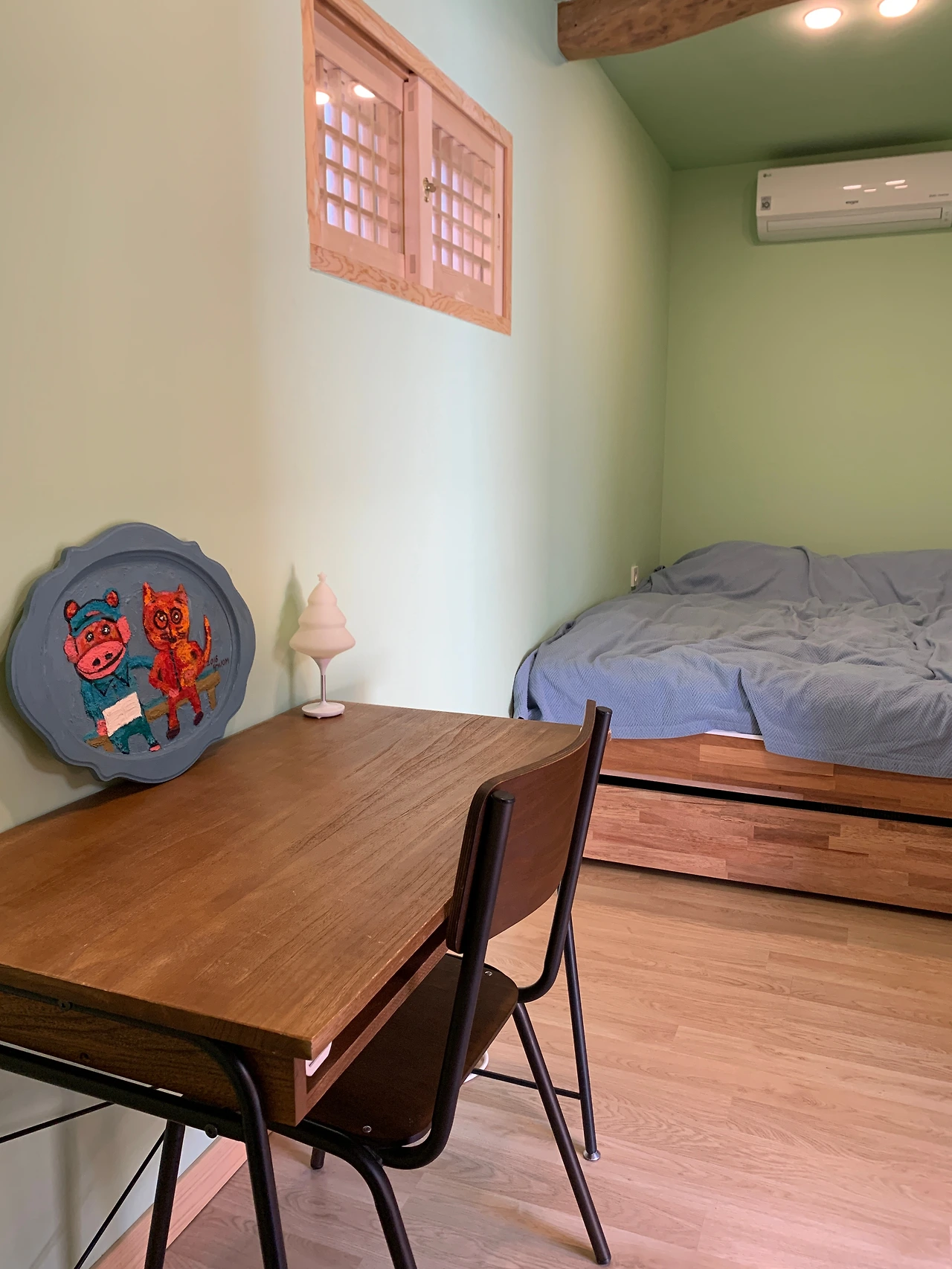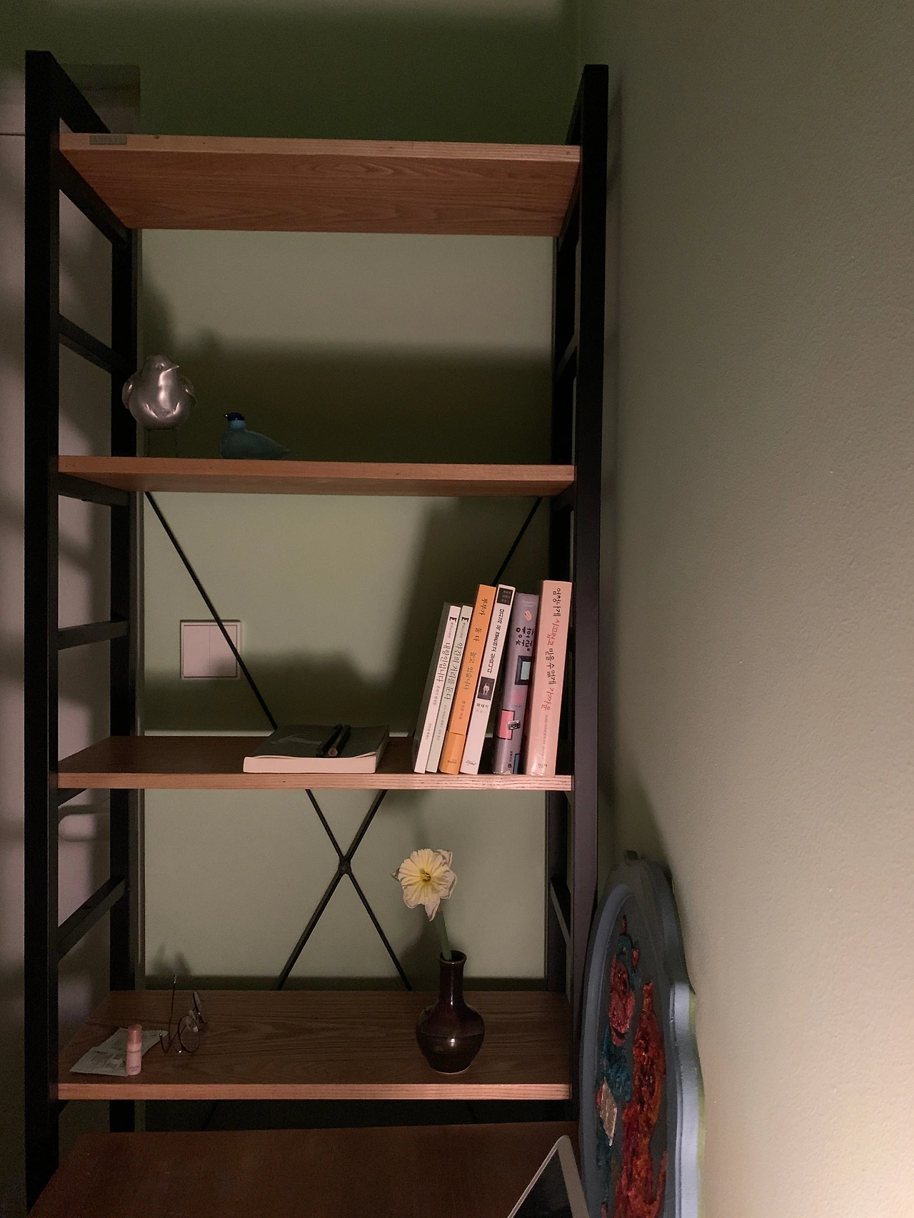 이렇게 만들어진 손님방에 붙박이 침대를 넣었죠. 그리고 며칠전 당근을 통해 책상과 책꽂이겸 수납장으로 사서 넣어 손님방에 작업의 기능을 추가했어요.