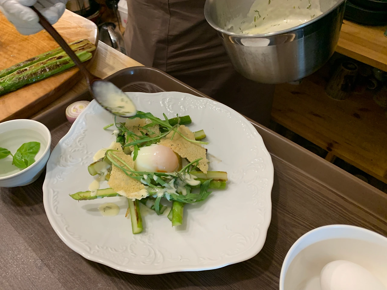이어진 음식은 화이트 버터 소스를 얹은 아스파라거스 구이였다. 올리브 오일에 재웠다가 잘 구운 아스파라거스에 버터에 딜과 바질을 넣은 소스와 파르미지아노 치즈를 구워 칩으로 만들어 얹고 수란까지 올리니 이 것만으로도 완벽했다.