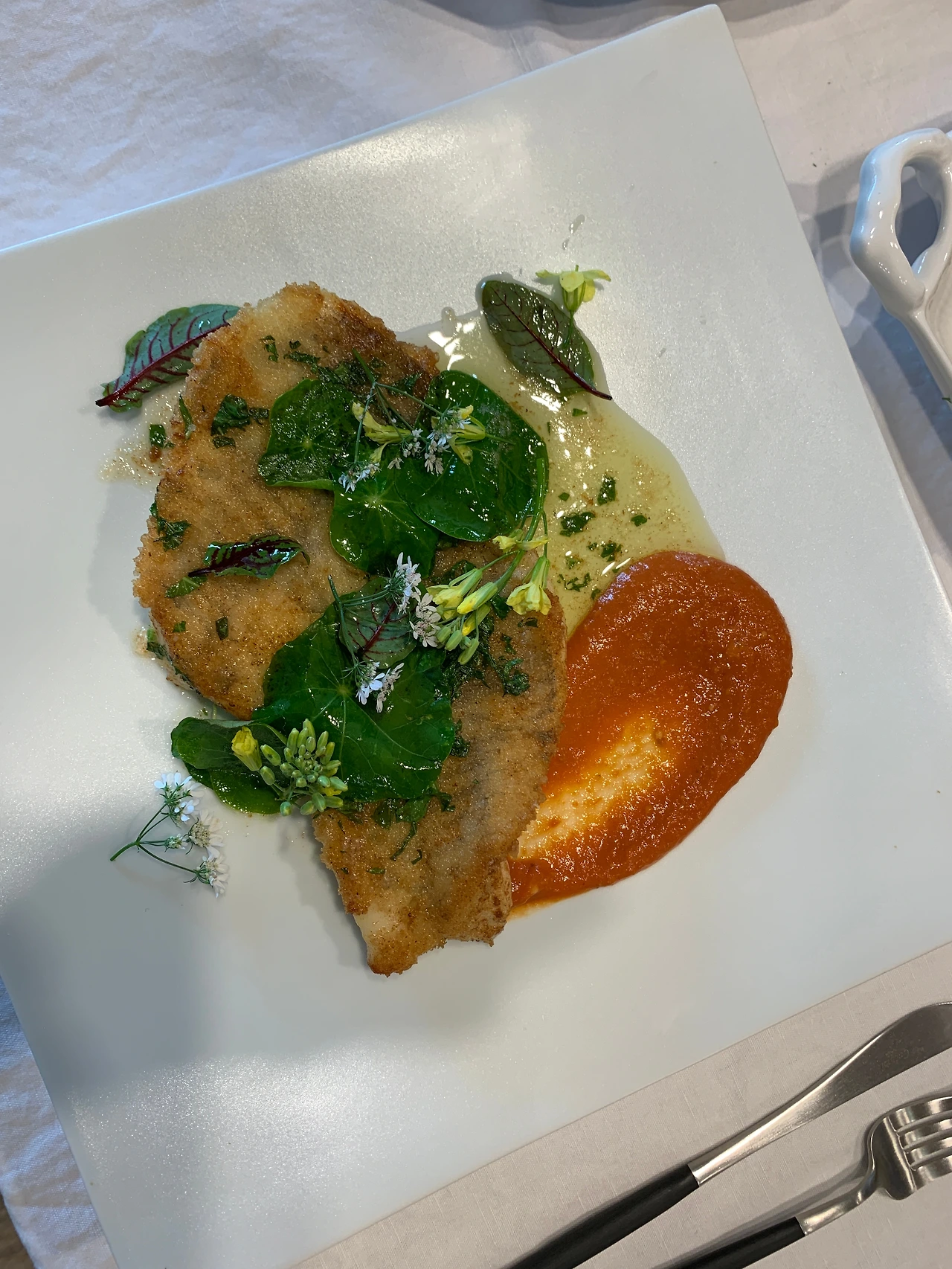 이 코스의 메인은 흰살생선 구이와 토마토소스라 할 수 있다. 손질하여 소금과 허브에 절인 흰 살 생선을 버터와 올리브 오일에 섬세하게 굽고 구운 토마토로 만든 소스와 같이 먹는다. 가나쉬로는 신맛이 나는 소렐과 함께 취향에 맞는 채소를 얹는다. 코스의 산뜻한 마무리는 신맛과 단맛이 어울린 레몬크림였다