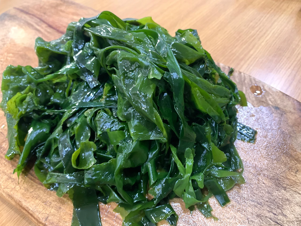 쫄쫄이 미역은 엽체가 가늘고 얇으며 씹을 때 쫄깃거린다고 해서 붙은 이름이라고 해요. 가늘고 얇은 미역의 특징을 십분 살려 뭉근히 오래 끓인 국보다 불려서 생으로 먹는 게 제격이죠. 엽체가 얇고 가는 특징은 빠른 요리를 가능하게 합니다. 미역을 잘라 찬물에 20분 정도만 불려도 요리를 하거나 생으로 먹을 수 있는 상태가 되더라구요.
