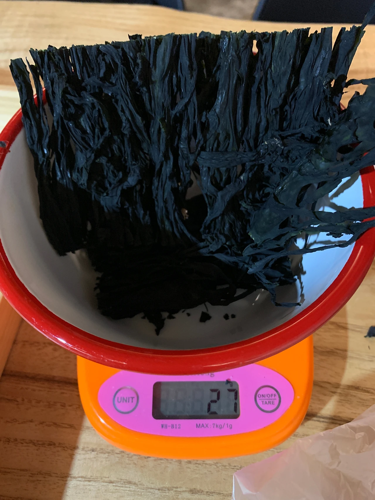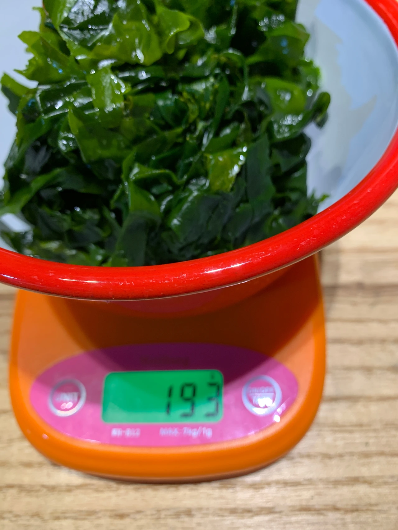 쫄쫄이 미역 한 장의 1/6쯤 잘랐더니 27그램, 20분 불린 후 물기 짜니 193그램.