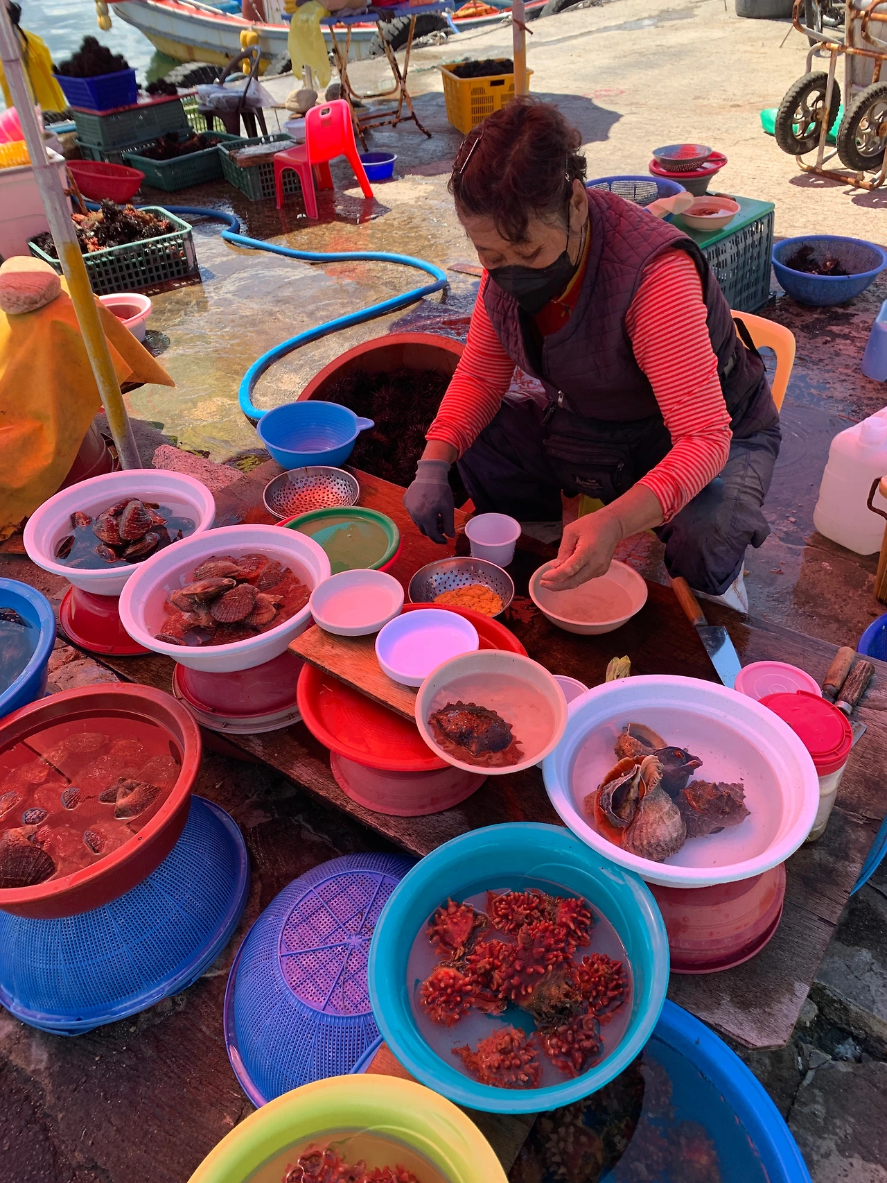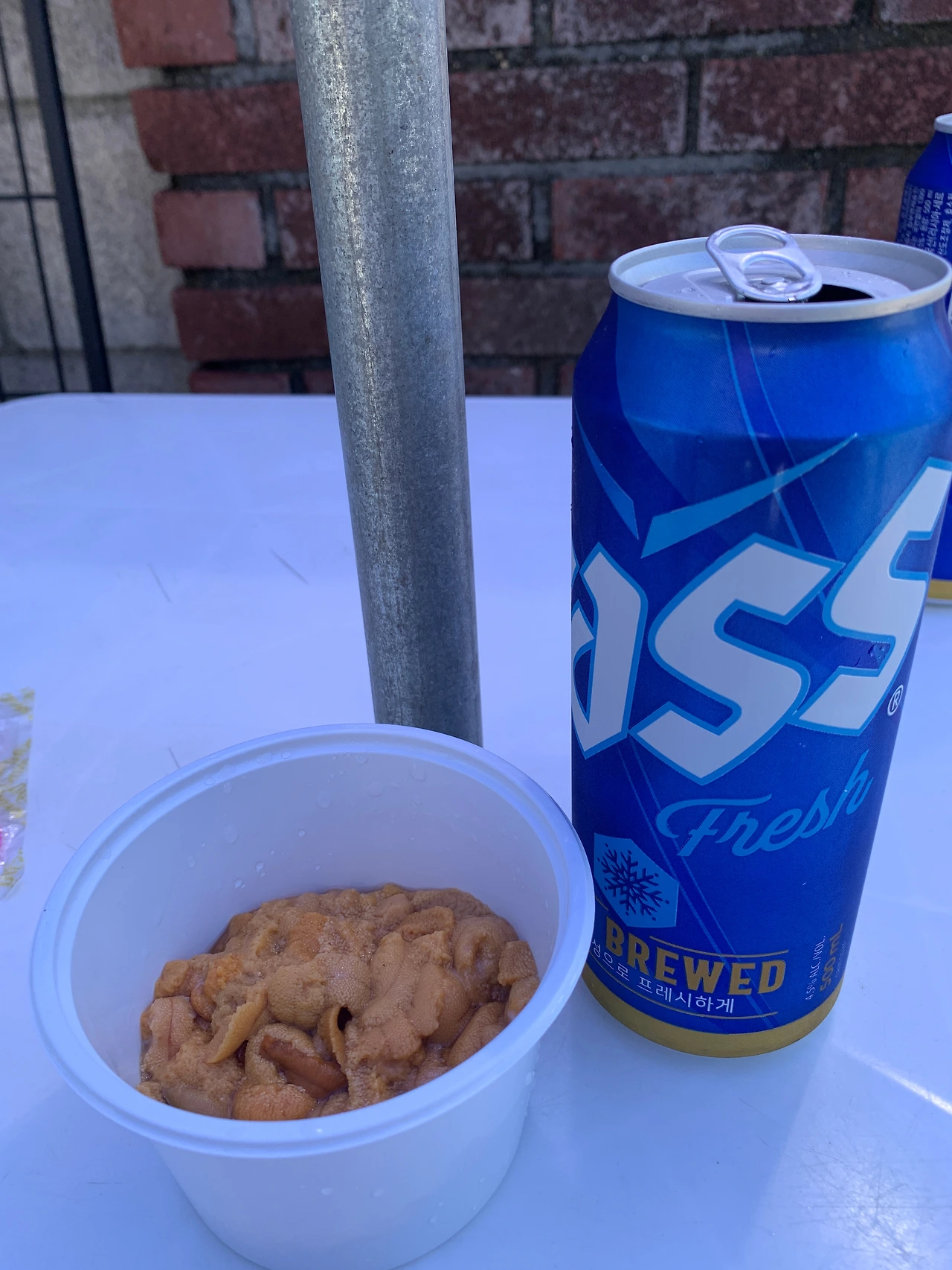 배는 불렀지만 영금정 근처 난전에서 파는 우니를 먹지 않을 수 없었다. 우리를 사서 근처 슈퍼 파라솔 아래에 앉아 맥주를 마셨다. 우니가 무척 달았다.