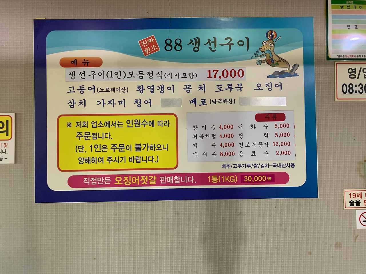 마지막 코스는 88생선구이. 생선구이를 팔아 빌딩을 세우고 골목의 상점을 사들인 것 같은 집였다. 운이 좋아 이런 집이 되진 않는다. 숯불에 생선을 손님의 테이블에서 구워주는 시스템였다. 반찬도 하나같이 맛이 좋았다. 다만 생선 구성을 제철것으로 하면 더 좋았겠단 생각이 들었다.