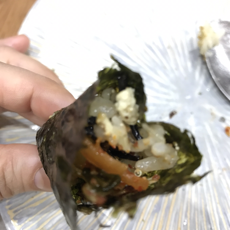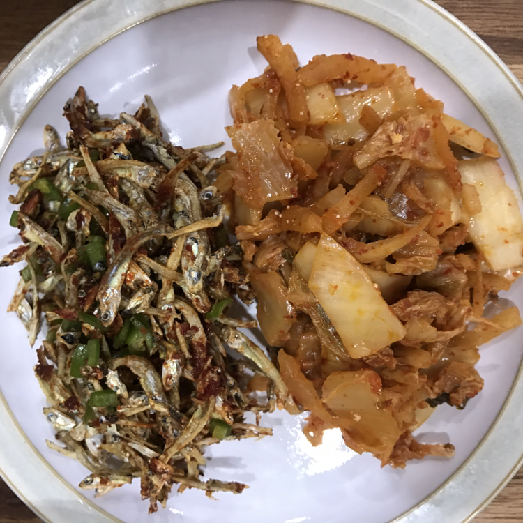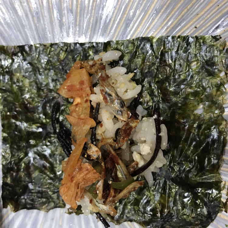 멸치를 살짝 볶고 매운고추를 넣고 고추장으로 비비고, 김치는 쭁쭁 썰어 볶았어요. 김 위에 밥을 놓고 그 위에 김밥속을 취향껏 넣어 돌돌 말아먹었습니다. 헤헤헤.