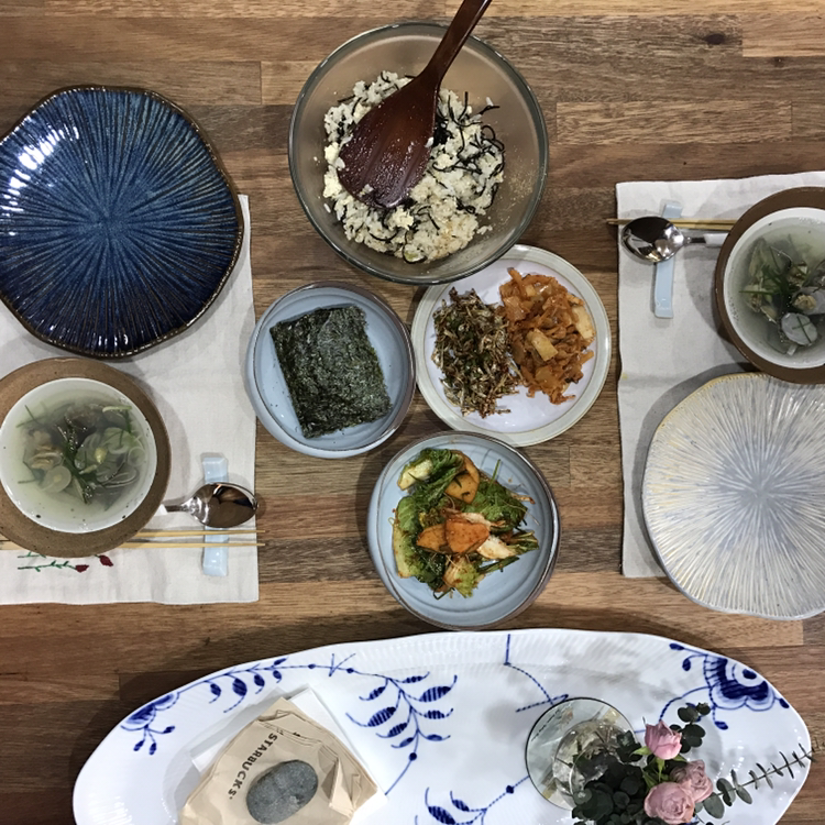 일요일 아침엔 조금 특별하게.톳, 두부, 명란을 얹어 밥을 지었어요. 아침부터 김밥타령을 한 남편에게 직접 김밥을 싸먹을 기회를 준 것이죠.