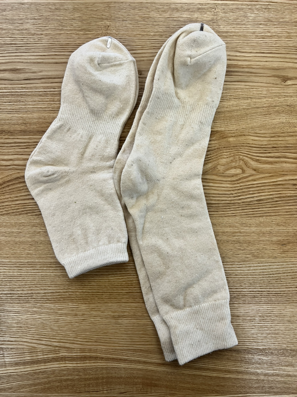 연한 크림색이며 목이 긴 것과 짧은 것 두 가지로 준비했어요. 성인에게 맞아요. 목이 짧은 양말은 230 정도에 적당하고 목이 긴 양말은 260에도 적합해요. 물론 그 앞뒤로도 좋죠. 발 냄새 고민이신 분, 신발을 오래 신고 계셔야 하는 분께 추천드려요. 대부분의 신발에 단정하게 어울려요.