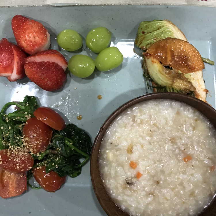 과일과 봄동김치를 반찬 겸 디저트로 준비했어요. 과일은 씻기만 해도 되니까요.