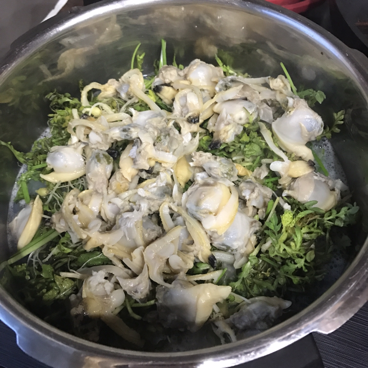 압력솥이 아니라 주물솥 등에 해도 비슷한 과정으로 합니다. 즉, 밥을 시작하고 밥물이 어느 정도 줄어들면 냉이와 바지락을 넣어요. 그래야 식감이 살아있답니다.