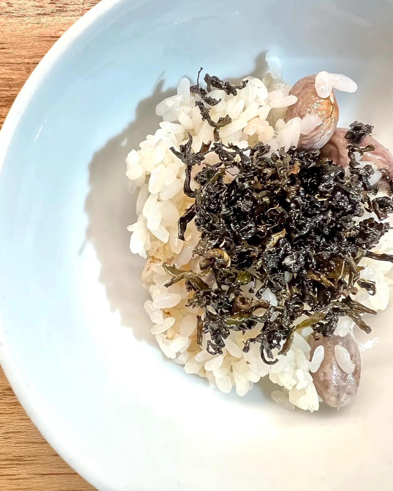 바삭하게 익은 미역 튀김을 밥 위에 얹어 먹는다. 끝