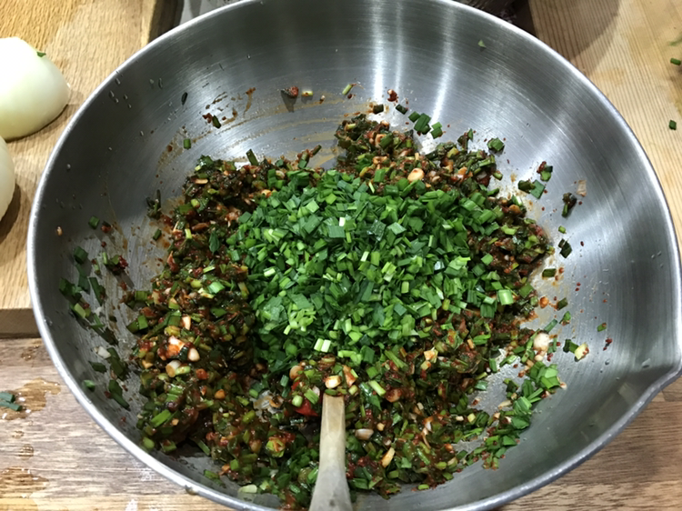 4. 쪽파, 부추는 5mm정도로 양파도 비슷한 크기로 자르고 김치소 재료와 함께 섞습니다.