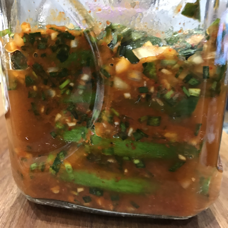 2. 염도 10프로 소금물을 끓여 손질한 오이가 잠기도록 부어줍니다.