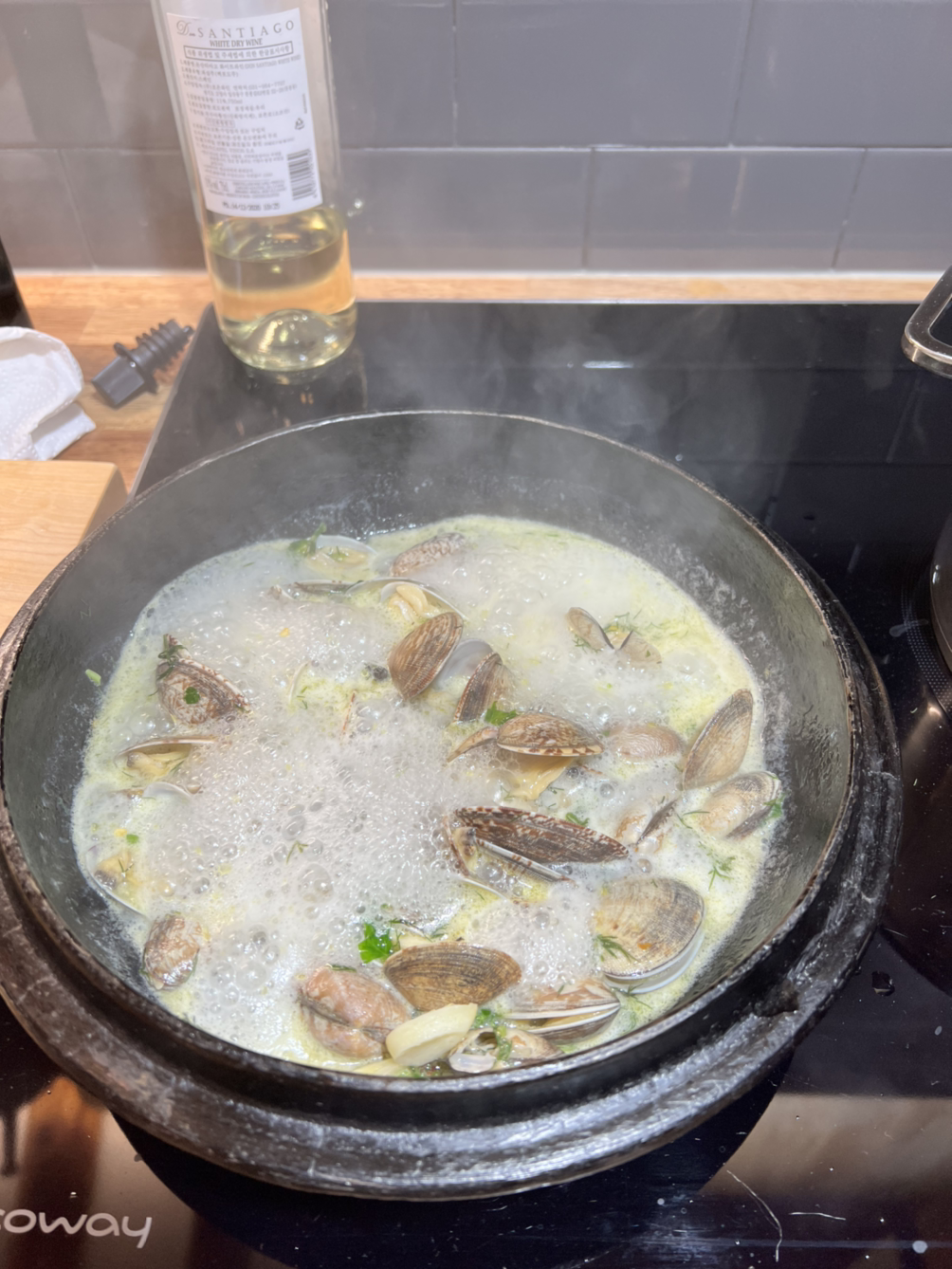 요리 수업 시건에 선생님께서 해주신 봉골레 파스타를 맛나게 먹고 저녁엔 복습 삼아 남편과 같이 만들어 먹었다. 물을 전혀 쓰지 않고 화이트 와인을 듬뿍 넣어 만들었다. 봉골레에 꼭 모시조개가 들어갈 필요는 없다. 요즘 모시조개는 너무 비싸고 바지락은 싸고 맛있다. 바지락을 듬뿍 넣자.