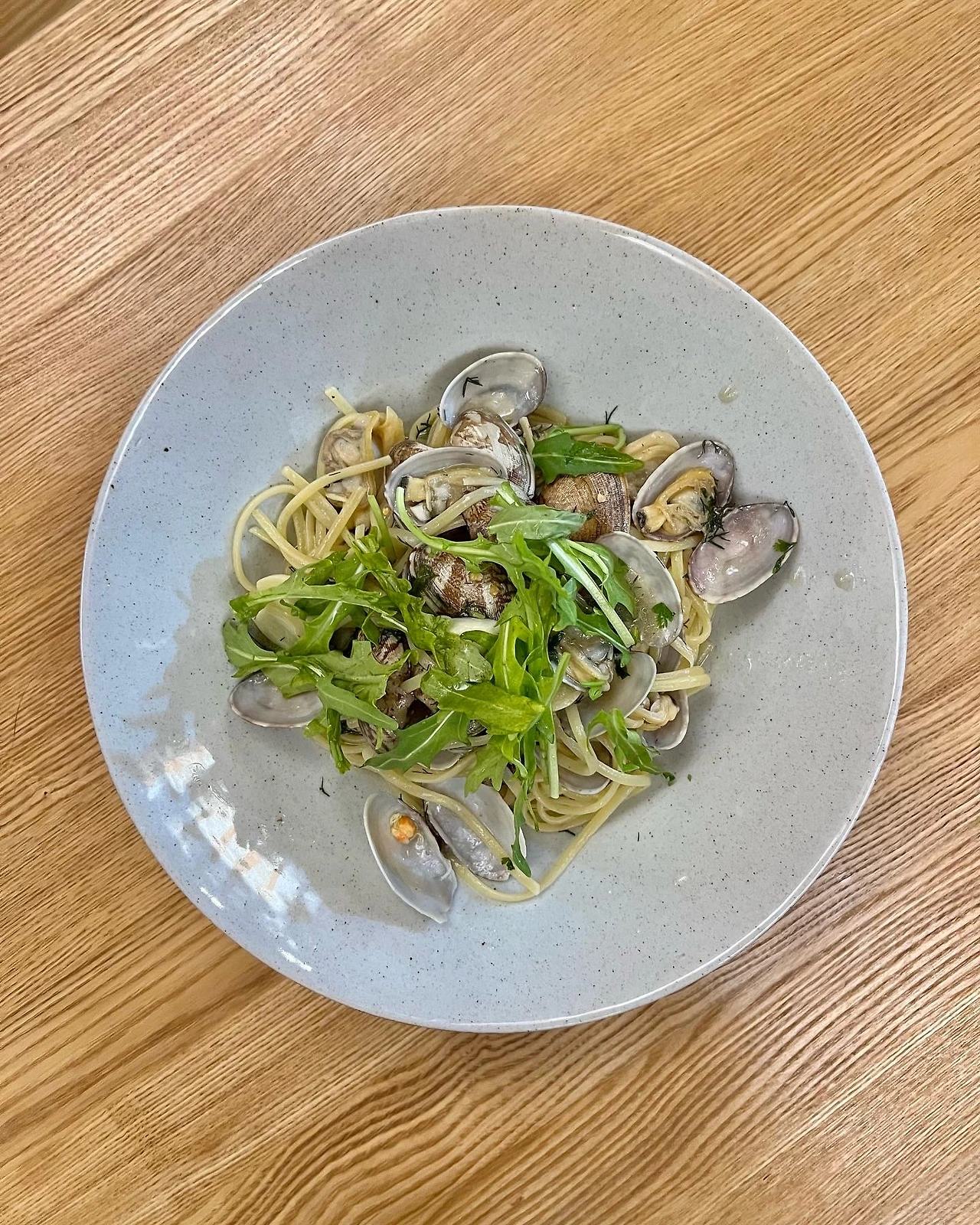 파스타 200g, 바지락 400g, 마늘 두 알, 페페로치노 두세 개. 이탈리안 파슬리, 화이트 와인 1컵, 올리브 오일