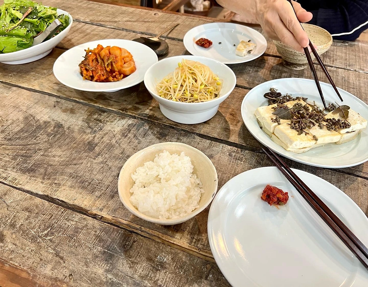 유겸 언니는 솥밥을 하고 봄나물 샐러드, 산초장아찌를 얹은 두부 부침, 콩나물 볶음을 해서 밥상을 차려 냈다. 남길 것도 버릴 것도 없는 채식 밥상이 너무 좋았다. 그릇은 또 어찌나 이쁜지. 단정하고 기품 있는 언니의 살림법은 언제 들여다봐도 질리지 않는다. 넘치는 것보다 치장이 빠진 것이 뭐든 더 마음에 남는다.