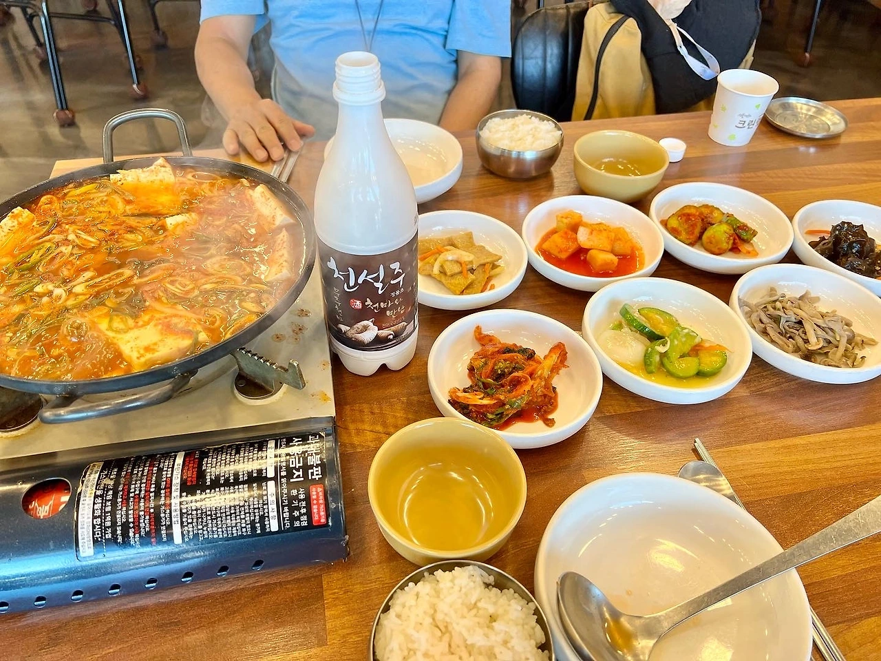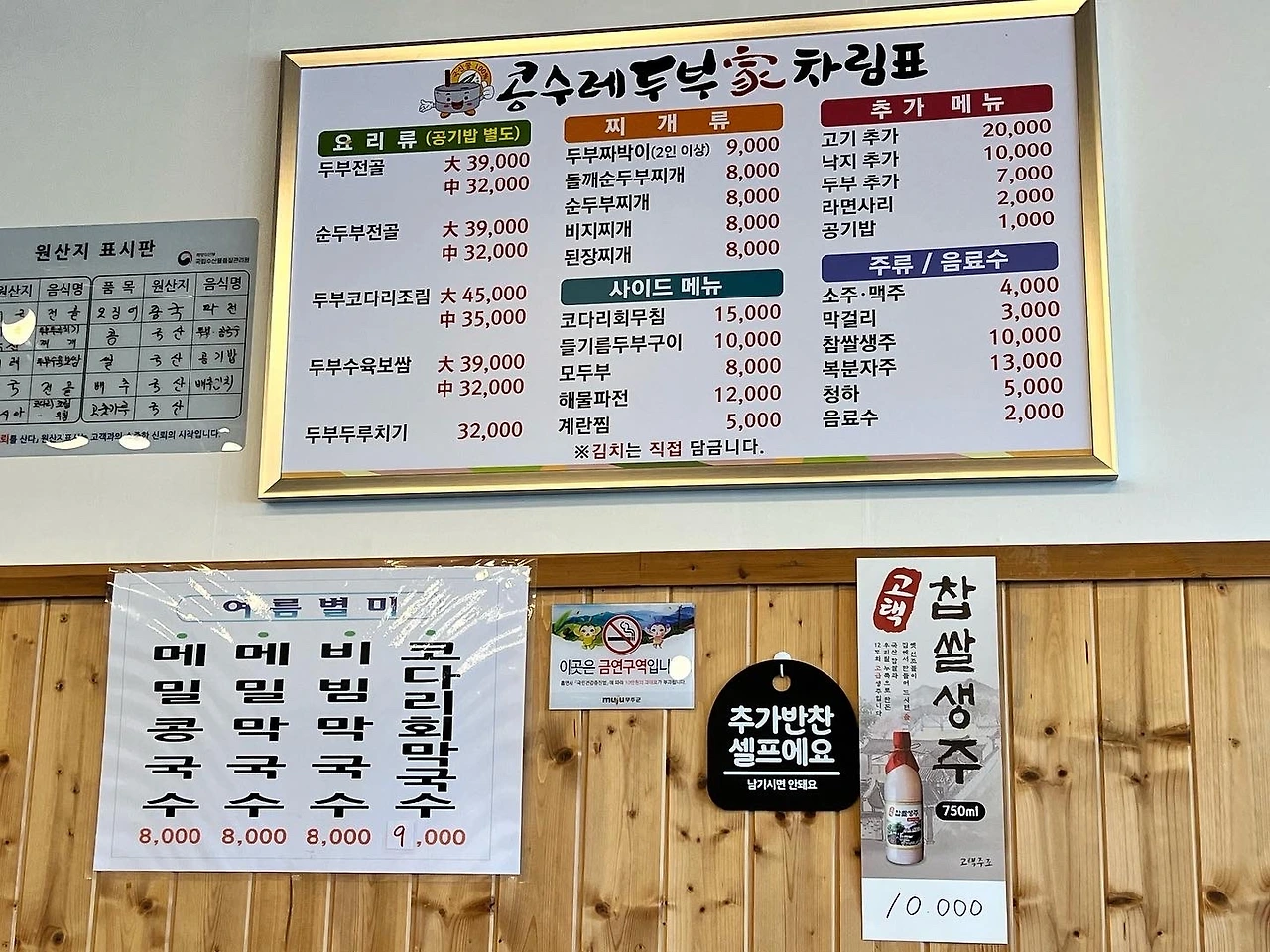 남편은 술이 한 잔 마시고 싶은 눈치다. 소주 대신 이 동네의 막걸리 ‘천설주’를 주문했다. 막걸리 맛은 평범했다. 천마가 들었다지만 2%의 천마로 맛이 달라지진 않을 테니 당연했다. 찌개 맛도 평범했다. 그러나 조미료 맛이 높지 않아 그것이 더 매력적였다. 두부가 더 먹고 싶은 우린 모두부도 하나 시켜먹었다. 우리가 먹는 것을 물끄러미 보시던 옆 테이블의 아저씨가 조심스럽게 어디서 왔냐, 언제까지 있냐 물으시고 올라가기 전에 <금강식당>에 가서 꼭 어죽을 맛보라 하셨다. 내일 메뉴는 어죽 당첨이다.
