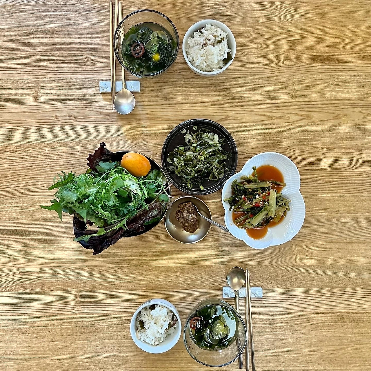 오이지 냉국은 표고와 다시마로 국물 내어 식힌 후 불린 미역과 오이지를 넣는다. 오이지 하나에 물 1리터. 국물 양념은 매실청 1큰술, 현미 식초 1큰술, 간장 1작은술. 청양고추 쫑쫑 썰어 넣고 얼음 띄우면 끝. 친구 어머님 텃밭 채소와 쌈장. 여름 밥상을 좋아한다.