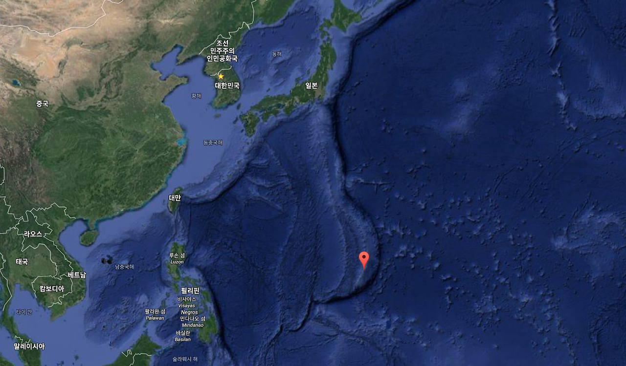 가장 아래쪽이 괌이고 북쪽으로 200Km 떨어진 곳이 사이판 섬이다.