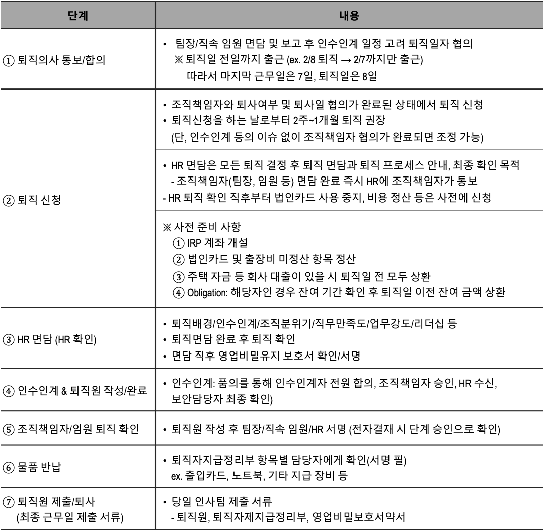 의외로 퇴직자들이 궁금한 건 퇴직하려 할 때 프로세스가 어떻게 되는지, 퇴직금은 언제 받는지, 월급과 퇴직금은 같이 입금되는지, 팀장한테 말해야 하는 지 HR에 말해야 하는 지 등의 자신과 직결된 거더군요. 전 회사야 연차 등이 다 시스템에서 자동처리 되었지만 스타트업은 이것도 궁금해 하는 분들이 많으니 프로세스에 연차 등이 어떻게 정산되는 지도 추가하심 좋을 듯요.