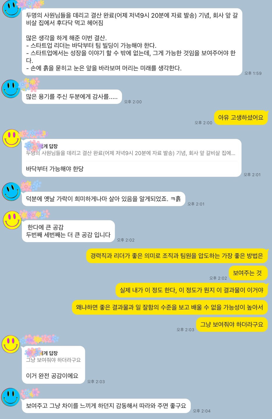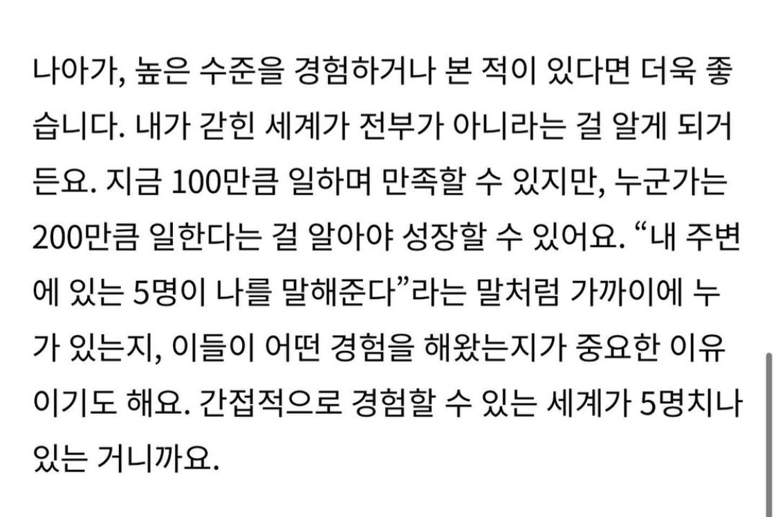 "보고 배운 게 없다"란 말은 단순히 상대와 조직을 비난하는 데에 쓰는 게 아니라 현실을 직시하고 이 상황의 역사를 이해하는 데에 쓰면 된다. 없으면 없는 대로 그래서 뭘 해야 하는지를 찾아내고 하나씩 실행하는 데에 집중하기도 바쁜 걸. 때론 그게 헤어짐일 수도 있고, 챌린지일 수도 있으며 칭찬일 수도 있고, 보고 배우게 할 영입일 수도 있는 거!