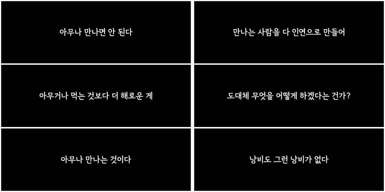 업무상 꼭 만나야 하거나 그냥 내가 보고 싶고 편한 사람만 만난다. 만나자 해도 대부분 거절이고 심지어 창업한 자영업자 주제에 미팅도 기준에 안 맞으면 거절하는 게 반이다. 미팅은 해도 세워둔 원칙에서 벗어나는 거 같으면 그것도 돌아보지 않는다.