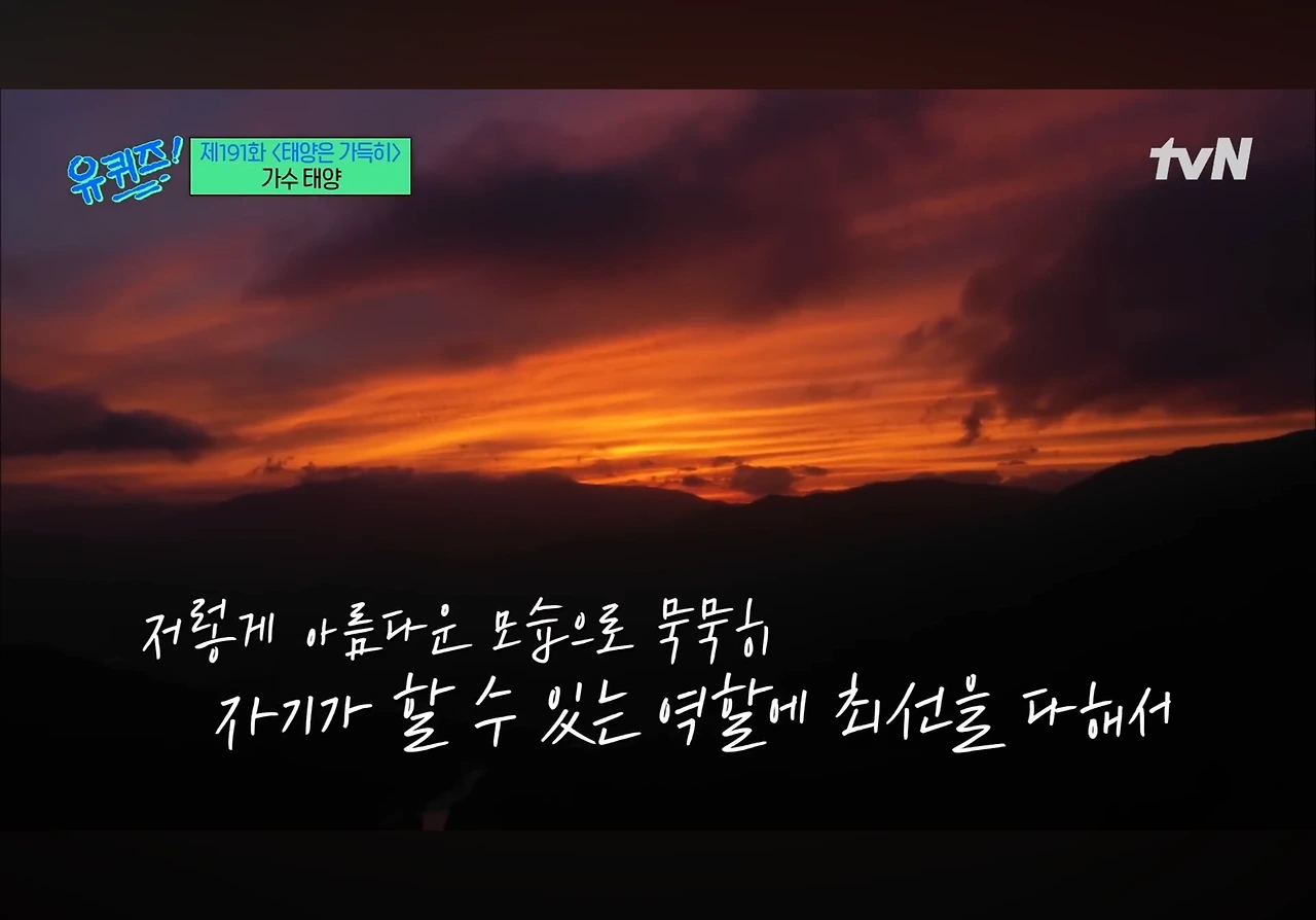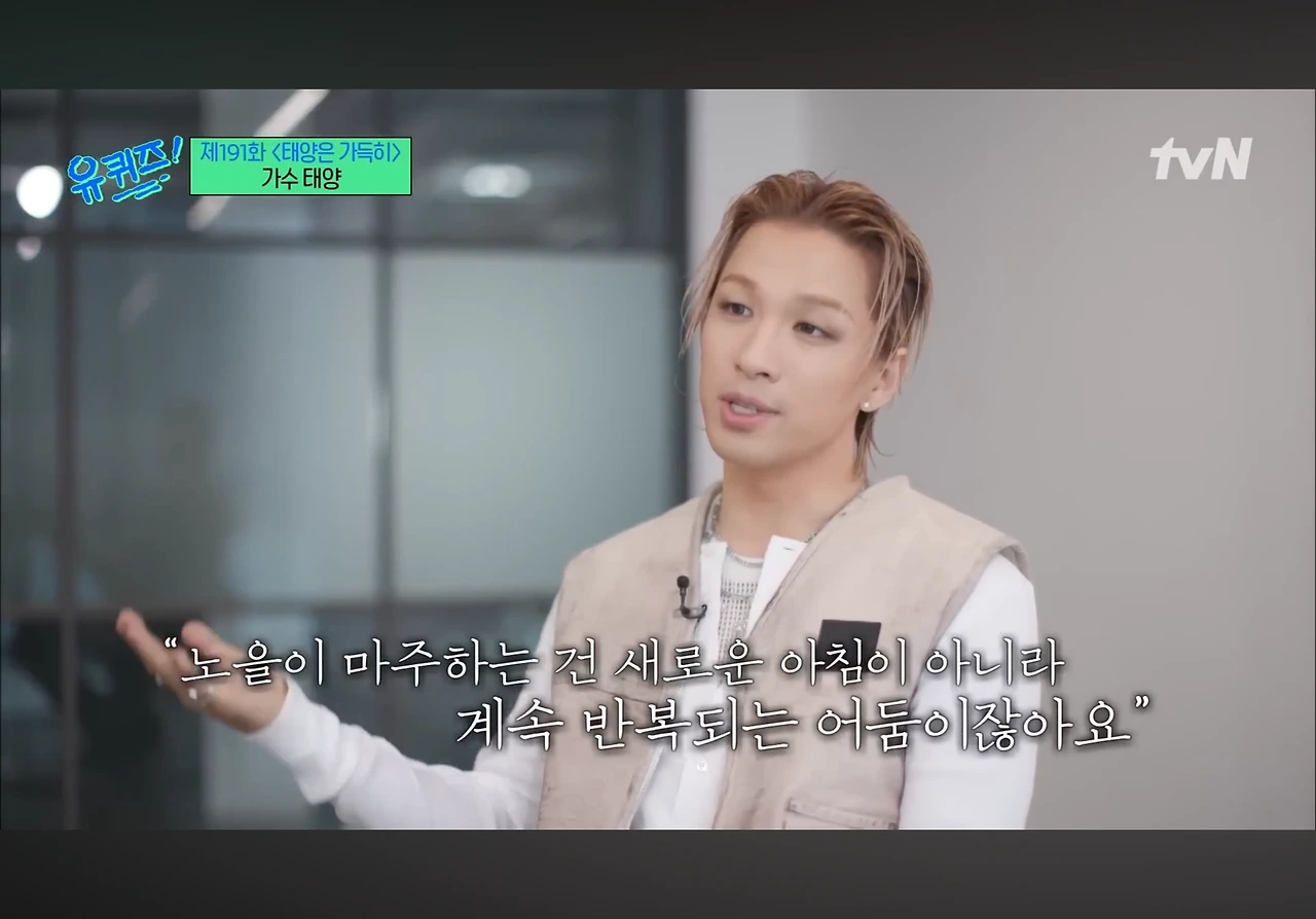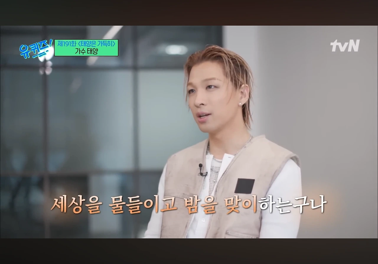 얼마 전 유퀴즈 GD 편을 보면서 예전에 태양이 출연했던 편이 기억나 다시 찾아봤다. 당시 노을을 빗대어 덤덤히 말하던 생각이 나서.