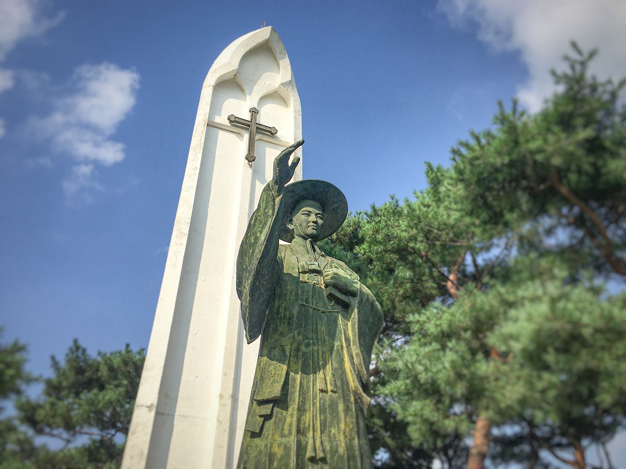 솔뫼성지의 김대건 안드레아. 나는 천주교 순교자 동상 앞에 서 있다. 그의 눈은 하늘 너머 어딘가를 향해 있고, 나의 마음도 그의 시선을 따라 뻗어 나간다.