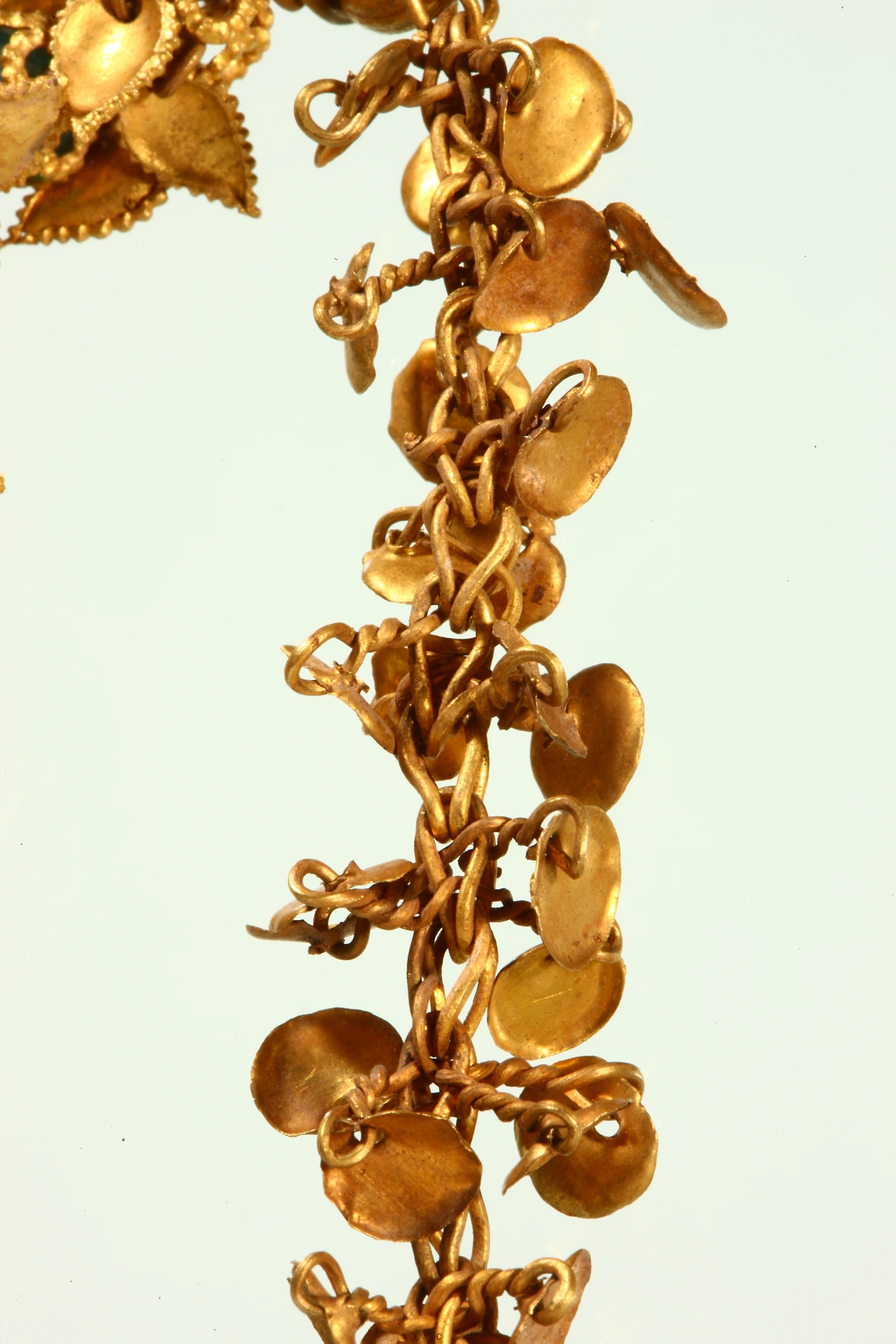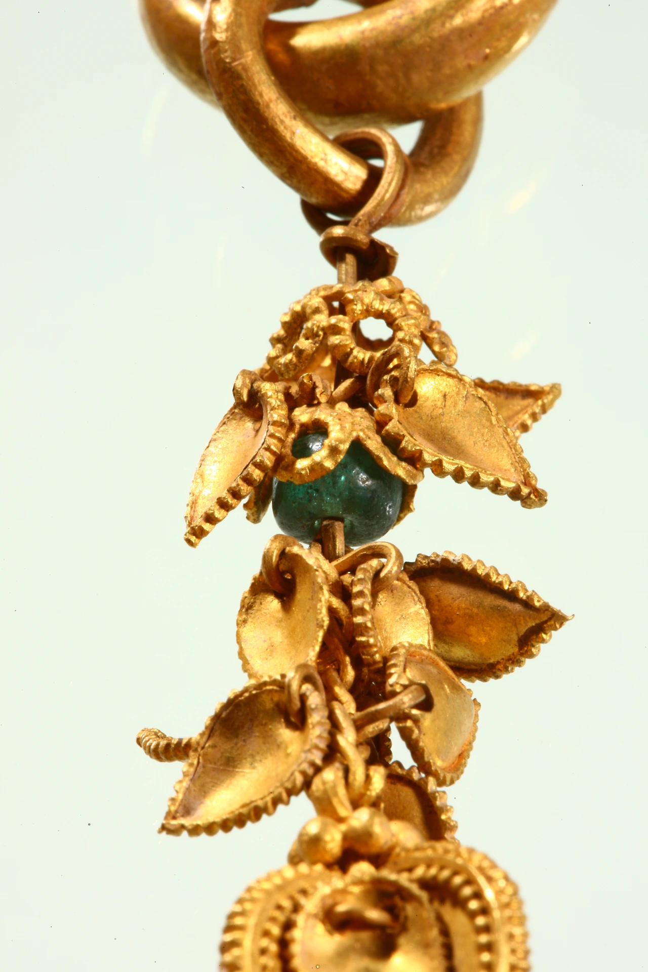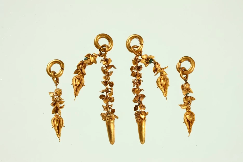 두 줄이 달린 귀걸이에서 긴 줄은 금으로 만든 줄을 꼬아서 사슬을 만들고, 거기에 원반 같은 장식을 다양하게 달아 놓았다. 하단부에는 낚시 추 같은 모양의 장식을 달아 마무리했다.
