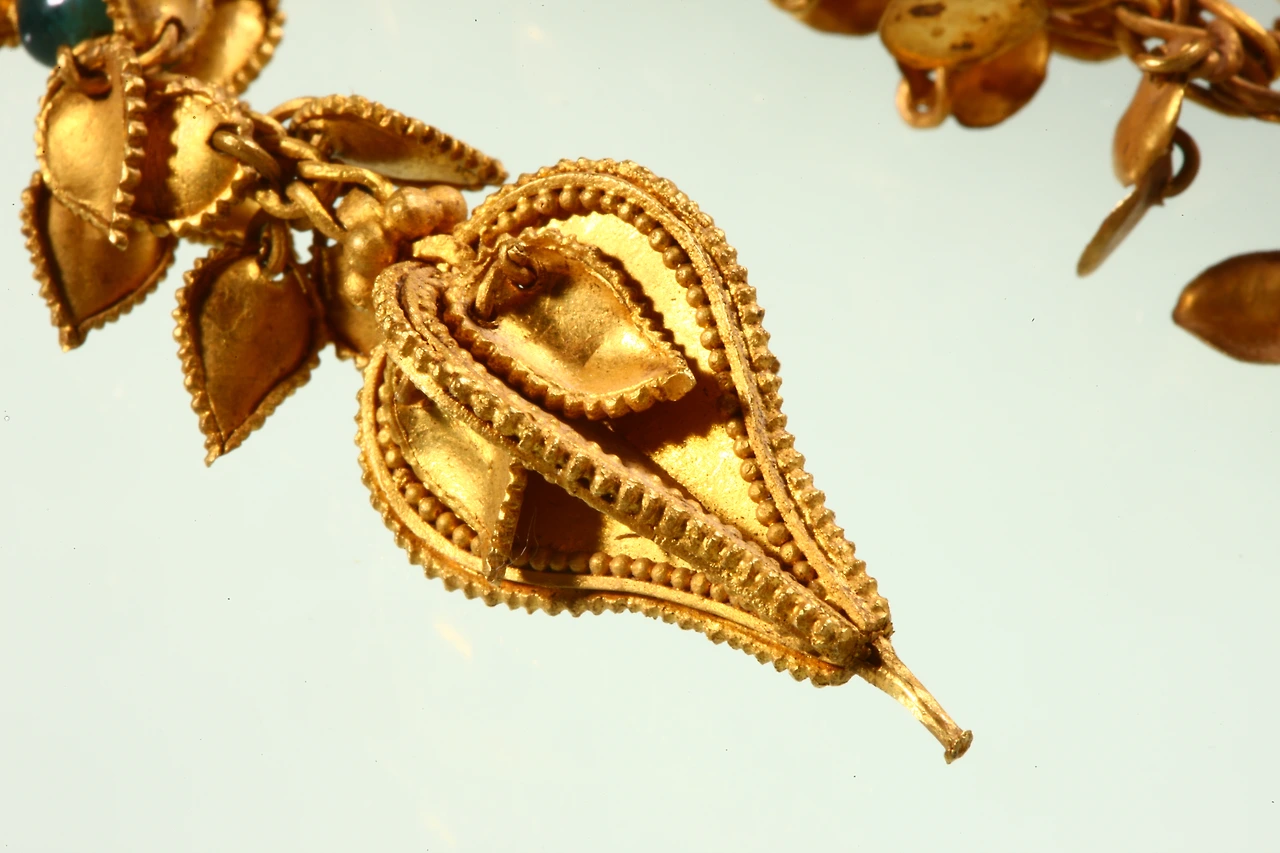 이제 두 개의 줄기 중 짧은 줄을 보자. 짧은 줄은 앞의 그것과 다르게, 나뭇잎 모양의 장식을 달았다. 나뭇잎 장식의 테두리는 새김눈테를 둘러 더 화려하게 장식했다(새김눈테: 금판에 촘촘히 홈을 내어 금알갱이를 이어 붙인 것과 같은 효과를 주는 장식 기법). 돋보기도 없이 일일이 눈으로 들여다보고 하나씩 작업했을 텐데, 그 정성이 대단하지 않은가. 그리고 그 사이에 짙은 초록을 색을 가진 둥근 옥을 함께 달아 장식성을 끌어 올렸다. 하단부는 보다 큰 나뭇잎 모양으로 장식해 상하단부 균형을 맞췄다.